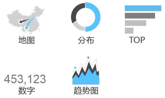 分析清楚數(shù)據(jù)后,就要找個合適的箱子把這些“蘋果”裝進(jìn)去。上一步,或許還可以靠自身的邏輯能力,采集到的現(xiàn)成數(shù)據(jù)分析得到,而這一步更多地需要經(jīng)驗和閱歷。幸運的是,現(xiàn)在已經(jīng)有很多成熟的圖形可以借鑒了。從和業(yè)務(wù)的溝通了解到,需要匹配的圖形有中國地圖、餅圖、top圖、數(shù)字、趨勢等。