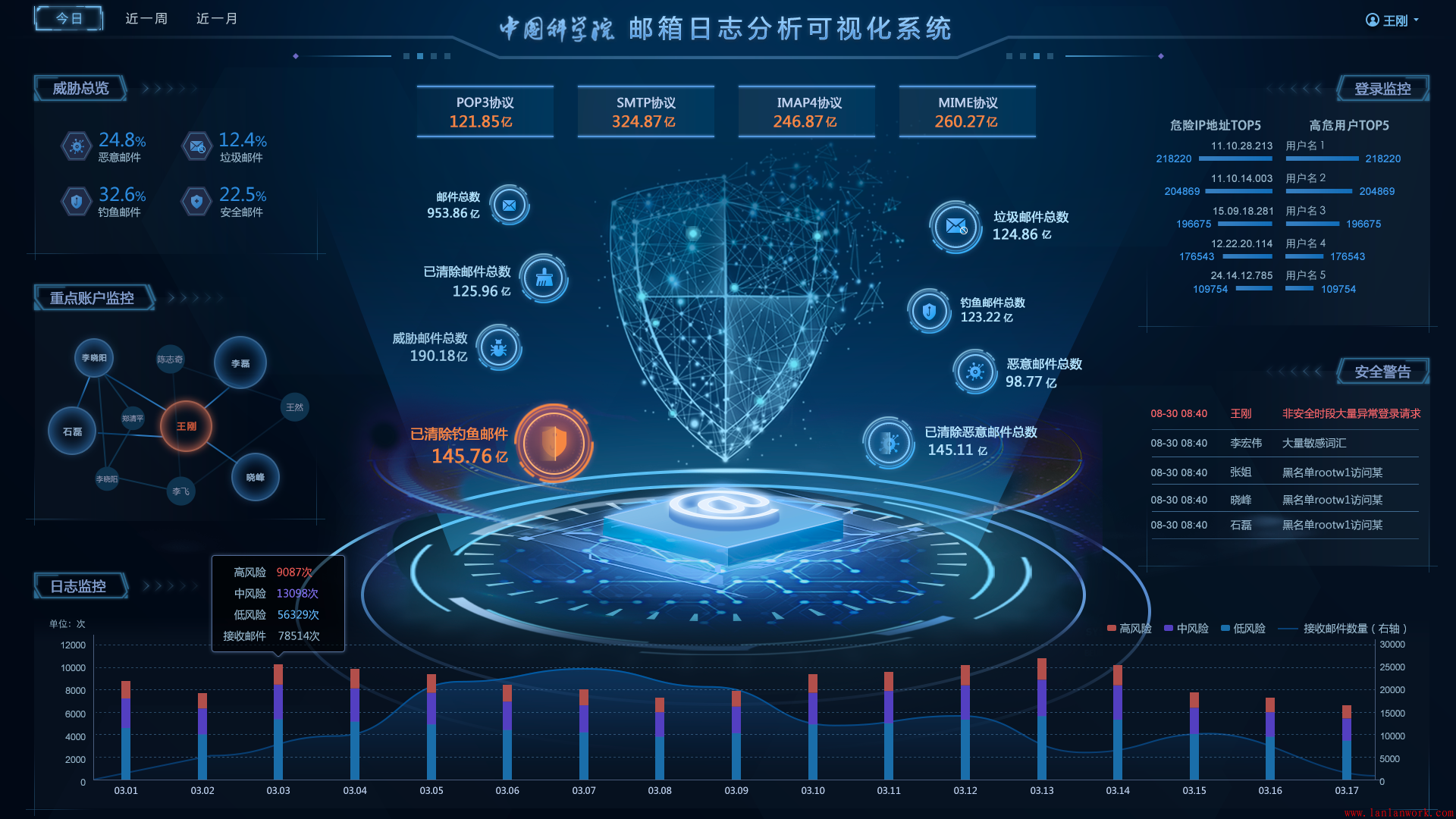 藍(lán)藍(lán)設(shè)計也在給中科院各個院所設(shè)計界面,上圖是給郵箱日志分析可視化系統(tǒng)設(shè)計的界面概念稿。為了設(shè)計好,我們搜集了各種資料文章和行業(yè)界面參考,了解郵件系統(tǒng)的行業(yè)術(shù)語,畫出交互原型、視覺設(shè)計稿。