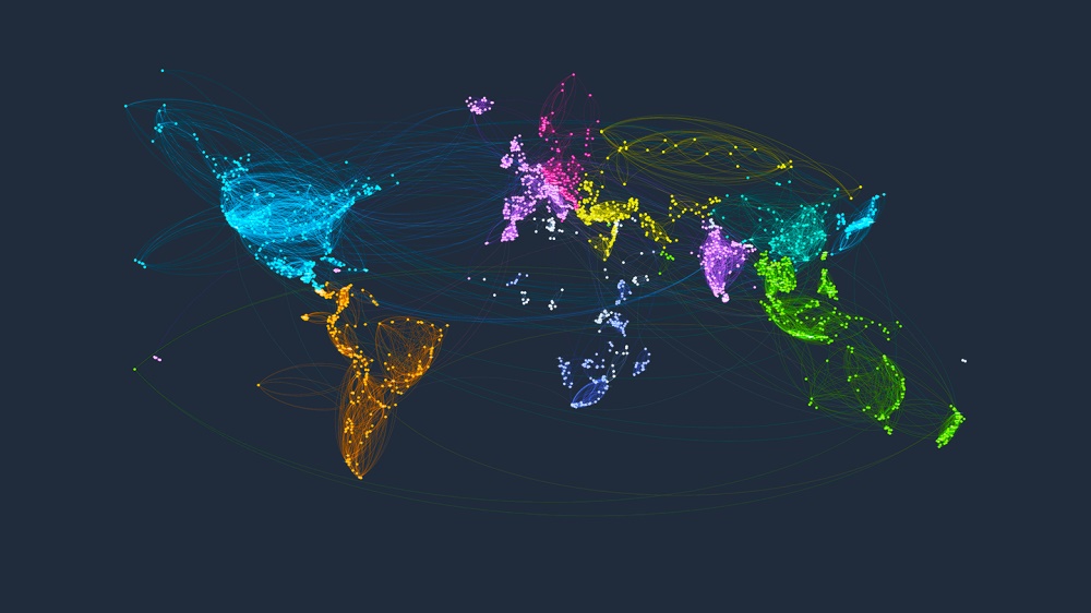 國(guó)家之間相互連通的旅游路線,顏色越相近的國(guó)家,表明兩個(gè)國(guó)家的人們互動(dòng)越頻繁。