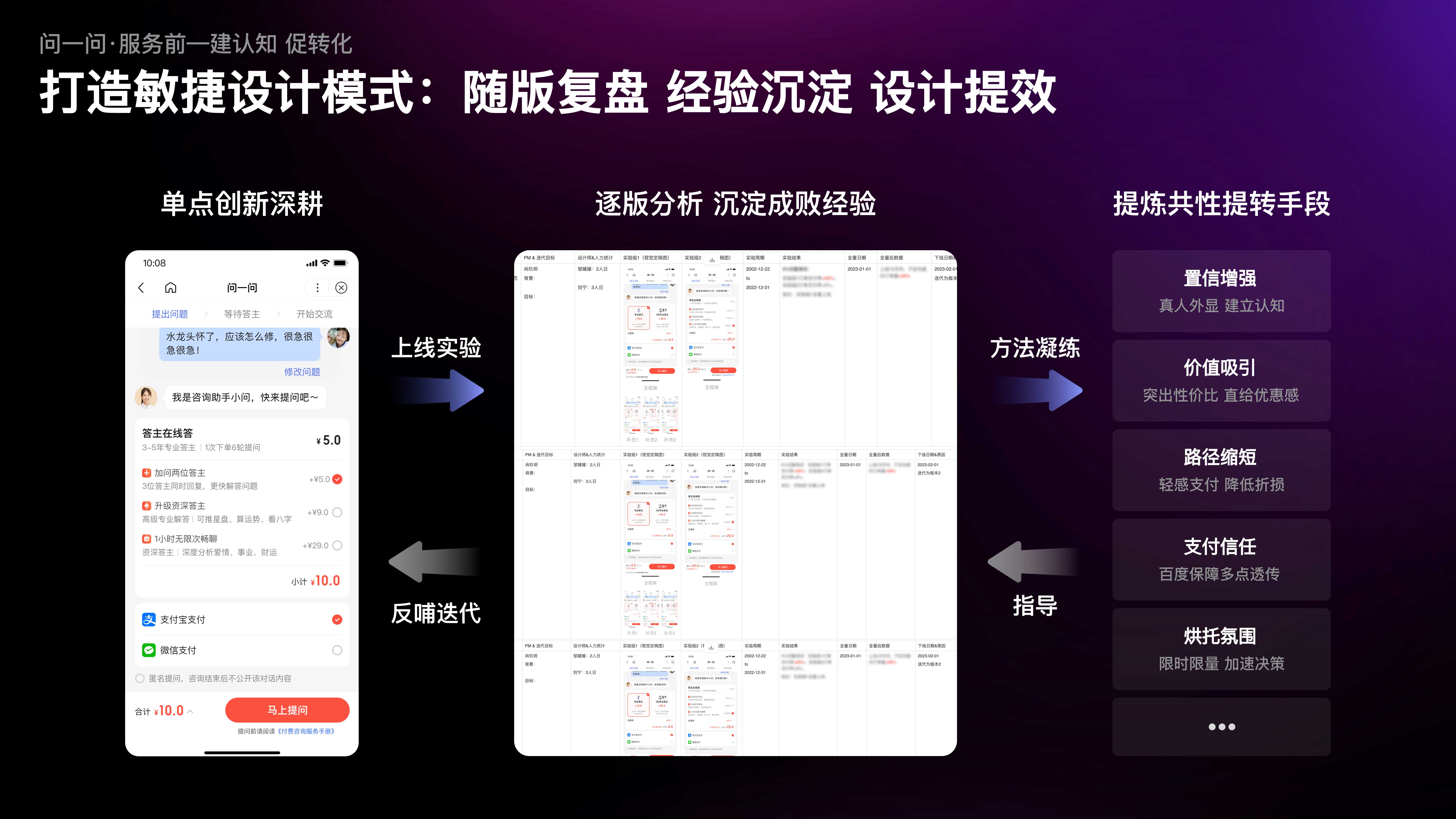 ?為了進(jìn)一步提升設(shè)計(jì)效率,我們將提問(wèn)頁(yè)的迭代歷史進(jìn)行線上化記錄,并組織團(tuán)隊(duì)定期復(fù)盤總結(jié),提煉出「真人外顯-增強(qiáng)置信感」「優(yōu)惠直給-突出性價(jià)比」「路徑縮短-弱化支付感」等一系列通用的提轉(zhuǎn)手段;又將這些手段復(fù)用到服務(wù)上下游環(huán)節(jié)的同類場(chǎng)景中,通過(guò)系統(tǒng)化提轉(zhuǎn),有效幫助業(yè)務(wù)訂單量、GMV大幅提升。