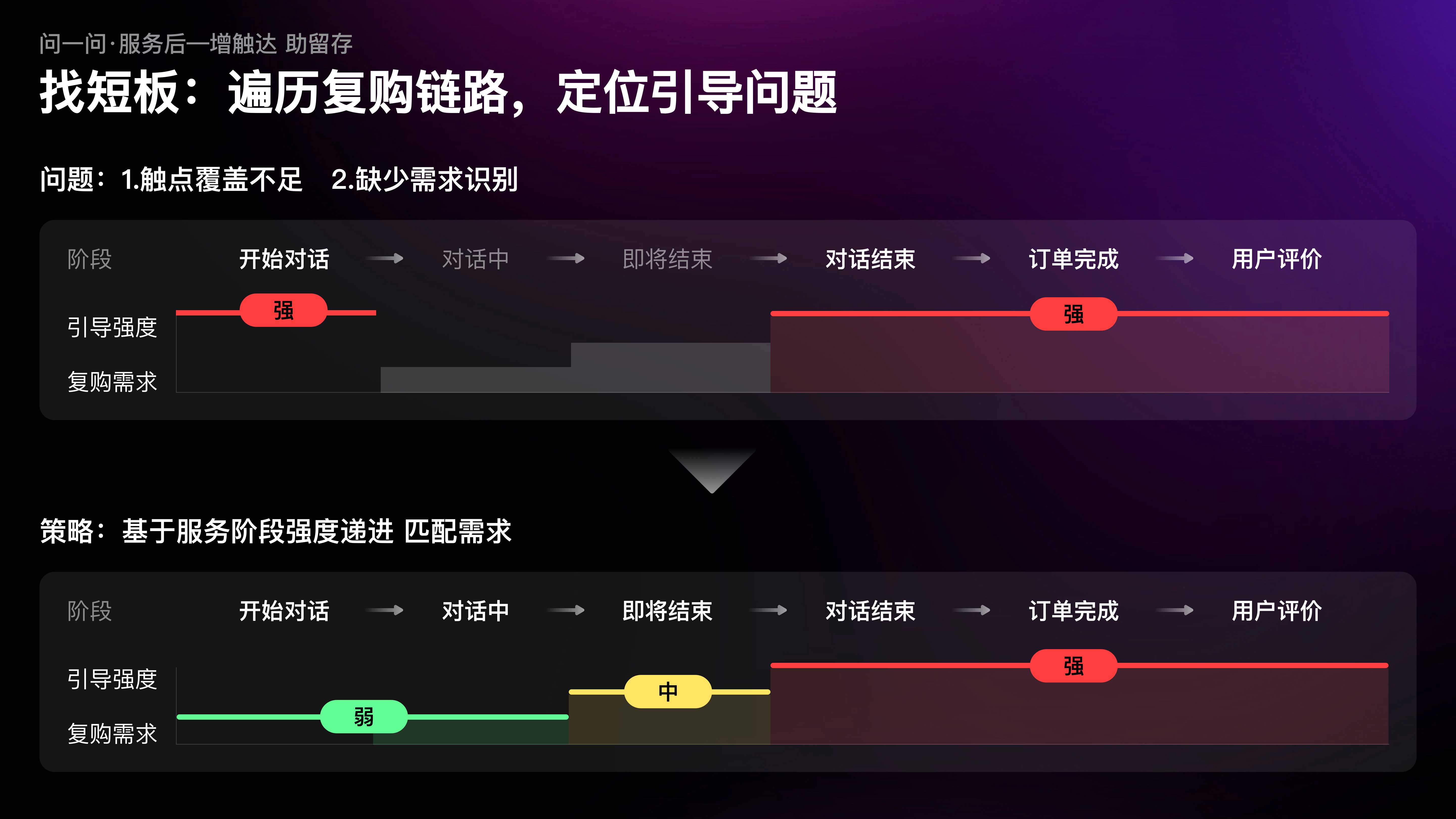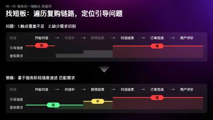 當(dāng)我們以用戶視角,遍歷咨詢鏈路中的復(fù)購(gòu)引導(dǎo)時(shí),發(fā)現(xiàn)復(fù)購(gòu)引導(dǎo)的觸點(diǎn)覆蓋不足,且缺少對(duì)特定場(chǎng)景下需求的識(shí)別,例如在咨詢開(kāi)始時(shí)復(fù)購(gòu)需求極弱,但設(shè)計(jì)引導(dǎo)極強(qiáng);而在隨后的對(duì)話過(guò)程中需求漸增,但引導(dǎo)缺失。因此,我們制定了行業(yè)首創(chuàng)的漸進(jìn)式引導(dǎo)策略;隨著服務(wù)推進(jìn),復(fù)購(gòu)需求漸增,觸達(dá)強(qiáng)度也逐級(jí)遞進(jìn)。