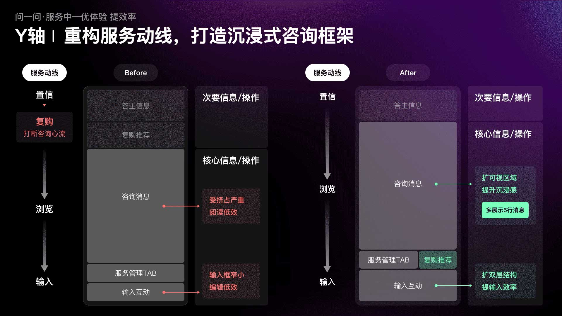 ?到了新的發(fā)展階段,我們的設(shè)計(jì)愿景該如何實(shí)現(xiàn)?問(wèn)一問(wèn)設(shè)計(jì)團(tuán)隊(duì)以“服務(wù)體驗(yàn)”為原點(diǎn),發(fā)起了C端核心服務(wù)體驗(yàn)的升級(jí)專項(xiàng)。借助用戶觀察、體驗(yàn)遍歷等方法,沿用戶真實(shí)體驗(yàn)路徑梳理服務(wù)“前-中-后”各階段的關(guān)鍵問(wèn)題、挖掘優(yōu)化機(jī)會(huì)。再結(jié)合設(shè)計(jì)、體驗(yàn)雙視角,建立以服務(wù)前“建認(rèn)知、促轉(zhuǎn)化”、服務(wù)中“優(yōu)體驗(yàn)、提效率”、服務(wù)后“增觸達(dá)、助留存”為核心指導(dǎo)原則的設(shè)計(jì)打法。通過(guò)切實(shí)滿足用戶在服務(wù)各階段需求來(lái)激發(fā)持續(xù)消費(fèi)、讓服務(wù)閉環(huán)順暢運(yùn)轉(zhuǎn),從而有效地賦能業(yè)務(wù)增長(zhǎng),達(dá)到體驗(yàn)和收入的雙豐收。