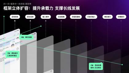 為實(shí)現(xiàn)這個(gè)目標(biāo),我們突破現(xiàn)有框架,創(chuàng)新制定了沿XYZ軸立體擴(kuò)容的思路。在Y軸方向上,進(jìn)行了屏效的優(yōu)化,滿足工具提效需求;沿Z軸拓展了層級(jí),滿足多元服務(wù)和互動(dòng)需求;最后,沿X軸探索第二空間,承載創(chuàng)新型體驗(yàn)。