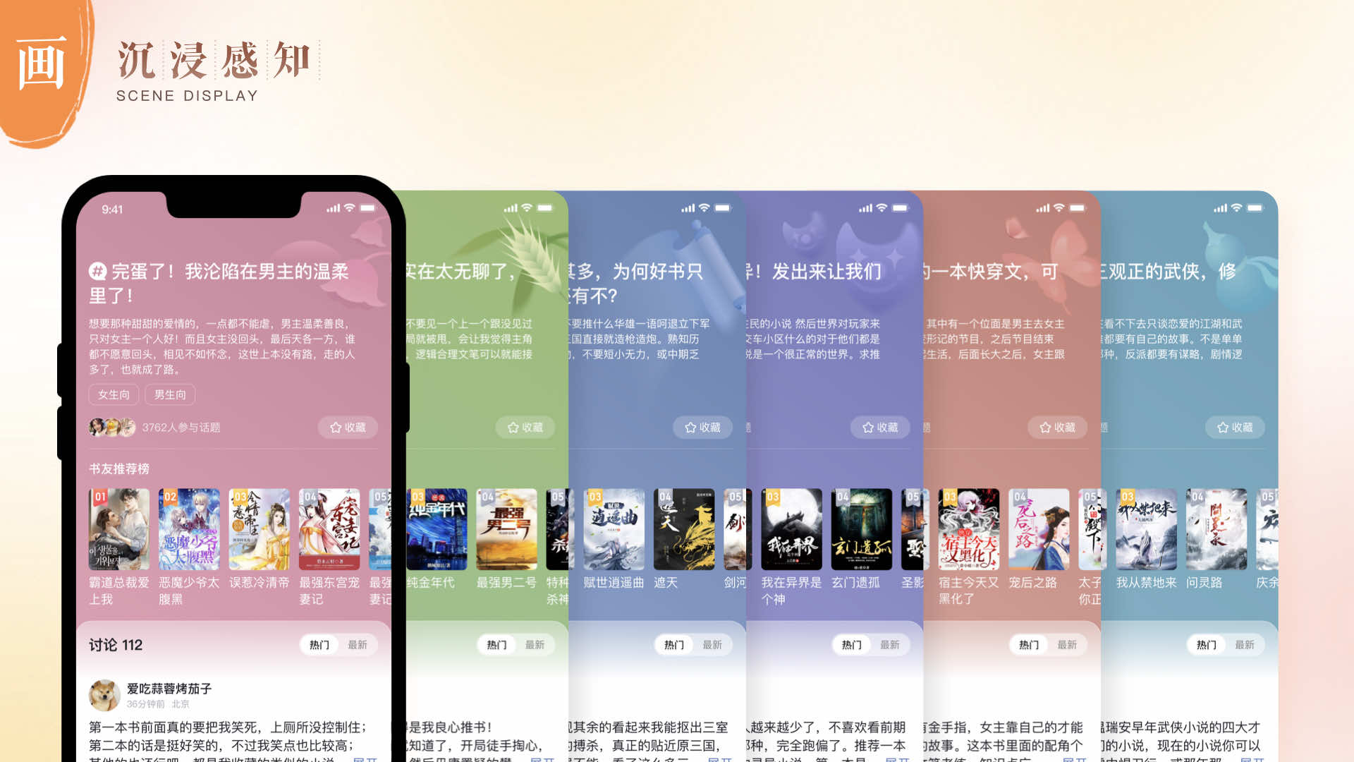人文感設(shè)計(jì)語言融合了簡約、舒適、自在的設(shè)計(jì)體驗(yàn),讓人能夠輕松沉浸其中,并感受到獨(dú)特的國風(fēng)韻味和情感內(nèi)涵。小說設(shè)計(jì)團(tuán)隊(duì)從“色、字、構(gòu)、畫”四個(gè)維度進(jìn)行拆解。