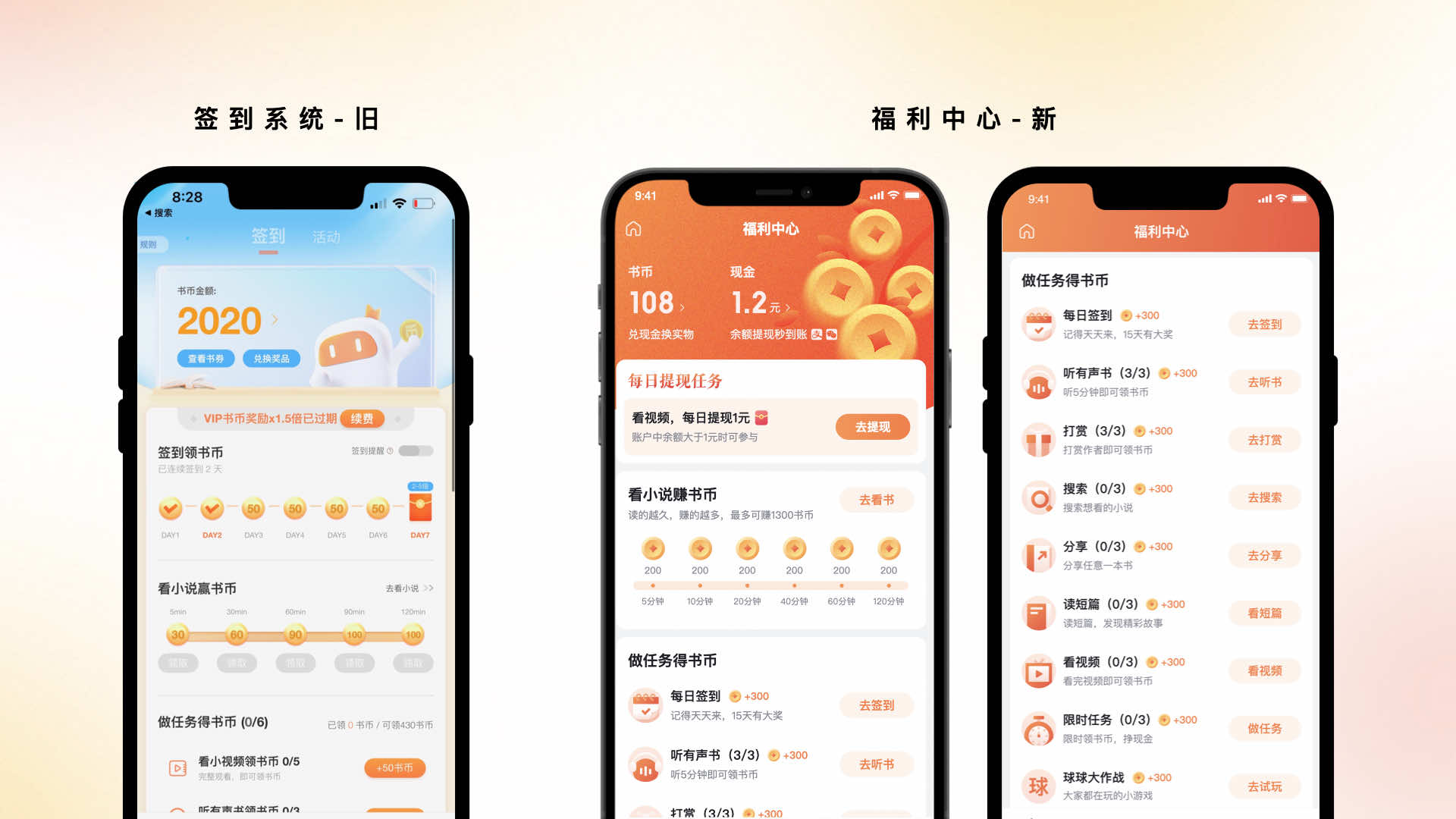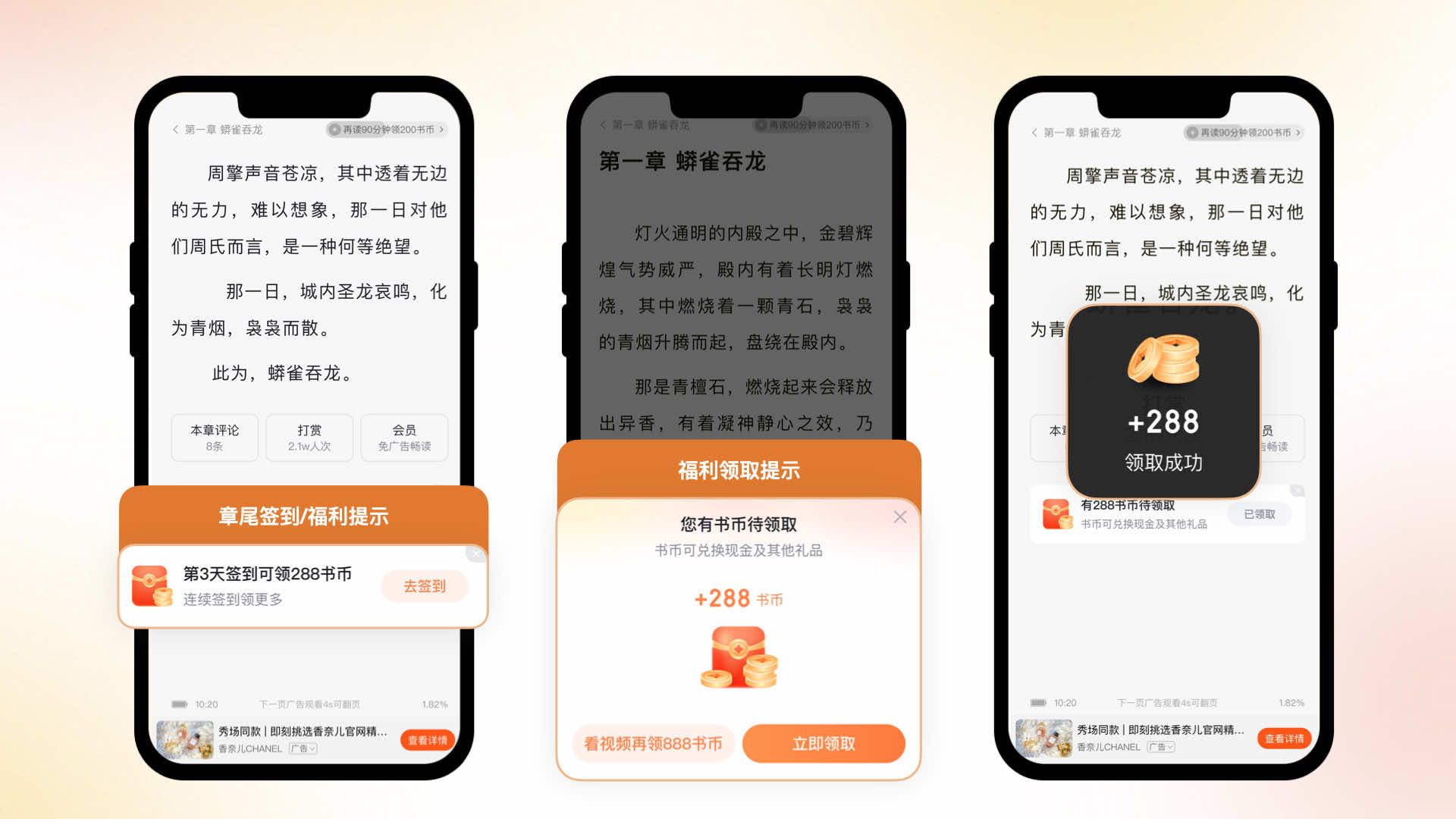 在閱讀器場景,我們?cè)黾恿苏挛埠桶雽咏饚蓬I(lǐng)取提示,即時(shí)提醒用戶領(lǐng)取福利,同時(shí),強(qiáng)化領(lǐng)取成功樣式,增強(qiáng)用戶的獲得感。