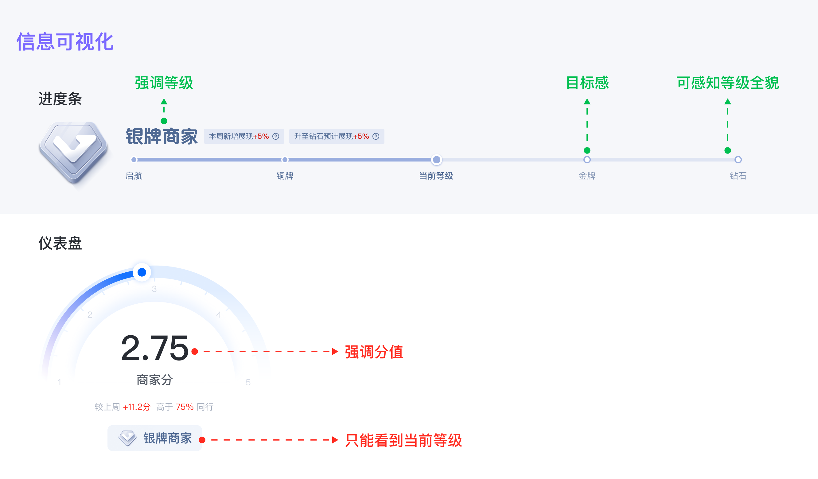 當(dāng)復(fù)雜的信息難以被商家理解時(shí),可視化作為有效手段,旨在把數(shù)據(jù)資料以視覺化的方式表現(xiàn)出,有效地向受眾傳播信息??梢暬紫纫鶕?jù)信息結(jié)構(gòu)進(jìn)行圖表選型,在商家等級(jí)項(xiàng)目中,我選擇了兩種數(shù)據(jù)圖表(進(jìn)度條VS儀表盤)來進(jìn)行商家等級(jí)的可視化表達(dá),當(dāng)兩種圖表放到一起時(shí),可以很明顯的發(fā)現(xiàn)兩者之間的差異,基于這個(gè)項(xiàng)目想要強(qiáng)調(diào)的等級(jí)概念,最終選擇進(jìn)度條展示商家等級(jí)的成長(zhǎng)進(jìn)度,并激勵(lì)其追求下一個(gè)等級(jí)的提升。這樣,商家能夠準(zhǔn)確感知成長(zhǎng)進(jìn)度,衡量自己在商家等級(jí)體系里所處的分位以獲取更多成長(zhǎng)動(dòng)力。