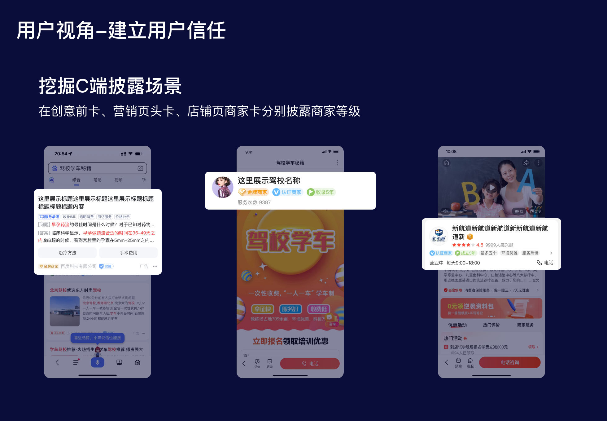從用戶視角出發(fā),商家等級(jí)項(xiàng)目的主要目標(biāo)是建立用戶信任,所以設(shè)計(jì)師在強(qiáng)化徽標(biāo)設(shè)計(jì)的同時(shí),更需要挖掘用戶視角的披露場(chǎng)景,通過增加C端披露,幫助用戶了解該商家在百度生態(tài)內(nèi)的等級(jí)情況,以輔助用戶決策。本項(xiàng)目中在C端共新增3個(gè)場(chǎng)景進(jìn)行商家等級(jí)的披露,①搜索前卡;②營(yíng)銷頁頭卡;③店鋪頁首卡。在3個(gè)重點(diǎn)場(chǎng)景披露商家的等級(jí)徽標(biāo),用戶在選擇商家時(shí)可以參考商家的等級(jí),增強(qiáng)對(duì)商家的信任和認(rèn)知。
