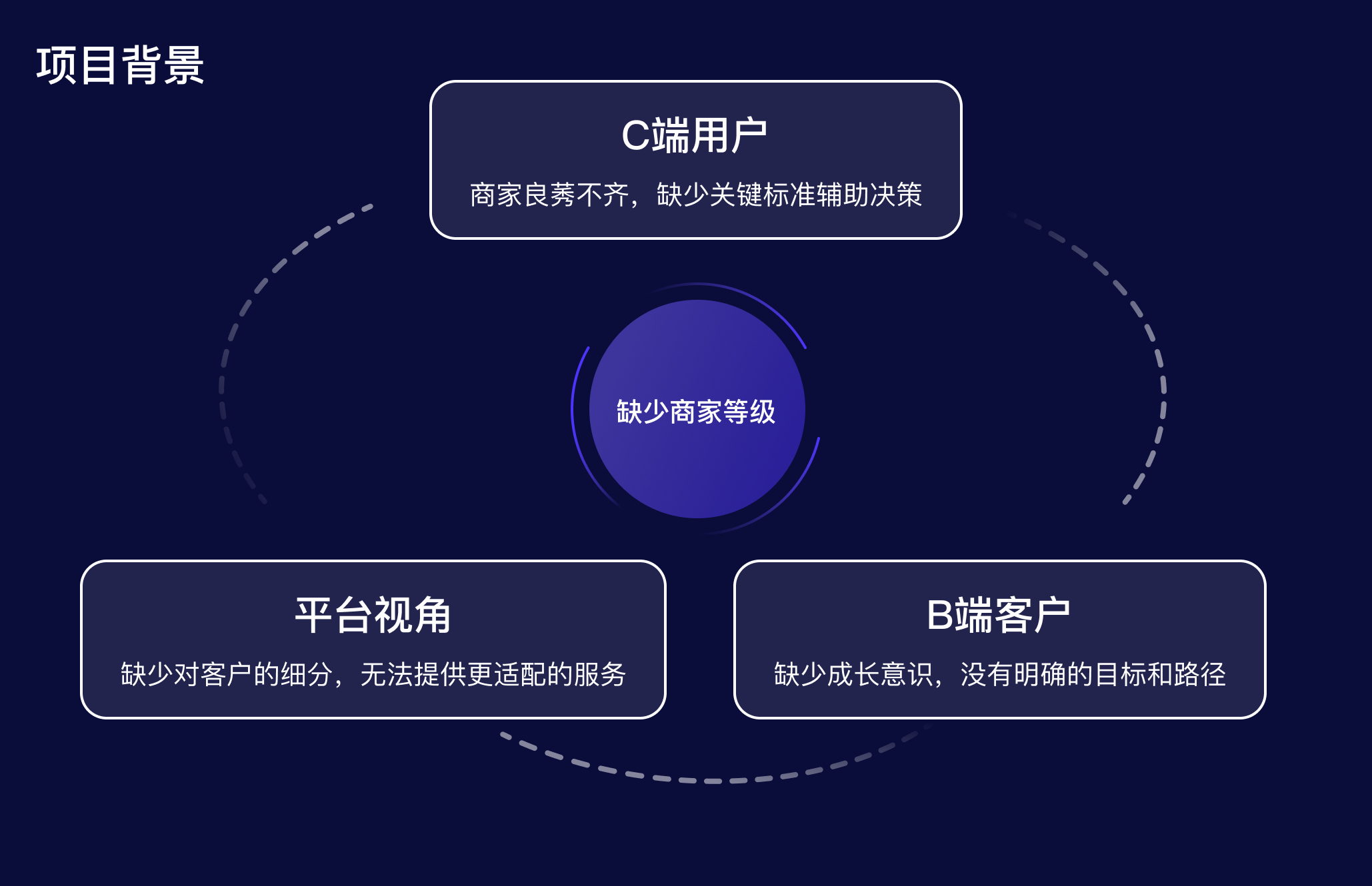 在設(shè)計(jì)之初,我們從不同的視角思考,對(duì)目標(biāo)進(jìn)行拆解和分析以獲得更全面、更多維的解決方案。從平臺(tái)視角分析,通過商家等級(jí)希望幫助商家快速定位服務(wù)短板,并提供有針對(duì)性的運(yùn)營(yíng)優(yōu)化策略,從而提高商家質(zhì)量和粘性;商家視角則希望通過商家等級(jí)獲得更多權(quán)益加持,從而提升轉(zhuǎn)化;C端用戶視角希望通過商家等級(jí),幫助降低決策成本,建立更多信任。