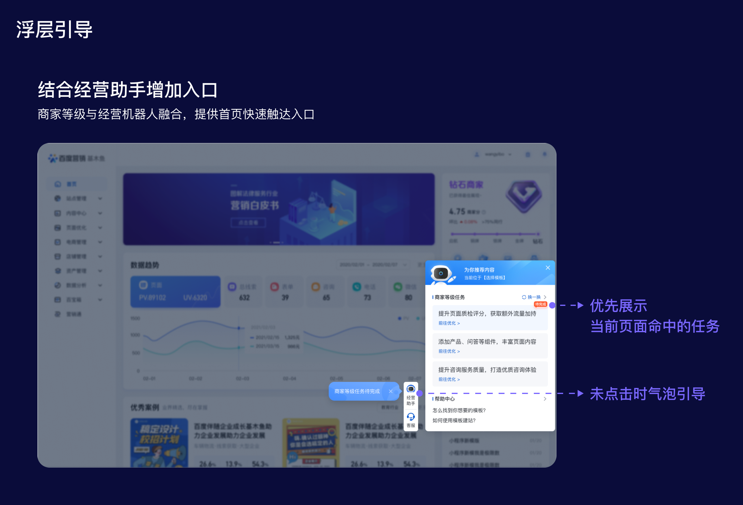 浮層:將操作入口前置披露,提升商家感知同時(shí)還可以縮短操作步長(zhǎng)。在商家等級(jí)項(xiàng)目里,衡量商家主動(dòng)經(jīng)營(yíng)的標(biāo)準(zhǔn)是做任務(wù),所以任務(wù)入口的前置披露是提升主動(dòng)經(jīng)營(yíng)的關(guān)鍵舉措。于是,圍繞商家等級(jí)包裝了“經(jīng)營(yíng)助手”的概念,幫助平臺(tái)給商家推薦一些成長(zhǎng)任務(wù)和優(yōu)化建議,并在平臺(tái)首頁主動(dòng)彈出,以此提高任務(wù)觸達(dá)率。但使用這種主動(dòng)觸達(dá)手段時(shí),需要考慮對(duì)商家的打擾和阻斷情況,所以需要對(duì)主動(dòng)彈出的頻率作限制,然后配合氣泡和標(biāo)簽等視效元素吸引商家視線。這樣可以引導(dǎo)商家參與商家等級(jí)完成任務(wù),促進(jìn)其成長(zhǎng)和等級(jí)提升。