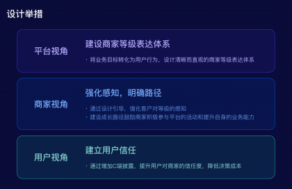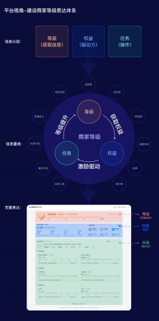 設(shè)計(jì)的基本出發(fā)點(diǎn)是幫助業(yè)務(wù)建設(shè)平臺(tái)等級(jí)模型的表達(dá)體系,將業(yè)務(wù)目標(biāo)轉(zhuǎn)化為用戶行為,設(shè)計(jì)清晰而直觀的商家分層表達(dá)體系,將不同商家等級(jí)與其對(duì)應(yīng)的特權(quán)、服務(wù)等信息進(jìn)行明確的關(guān)聯(lián)和傳達(dá),以便商家能夠快速理解和辨識(shí)商家等級(jí)的差異和優(yōu)勢(shì)。