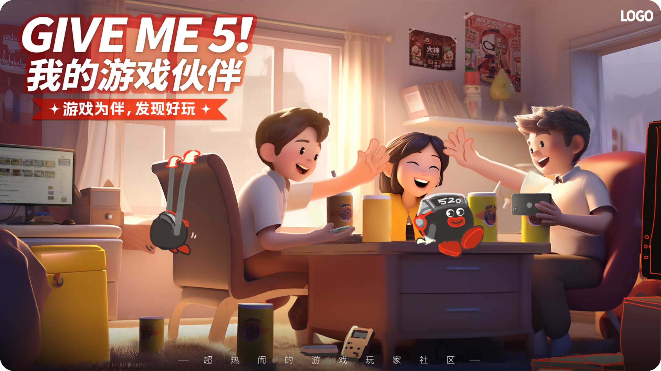 大概描繪了幾個伙伴在組隊玩游戲,因為獲得了勝利相互擊掌(give me 5)的輕松愉快的畫面。周圍有一些和游戲相關的元素,IP形象也在畫面中心露出,強調(diào)與品牌之間的關系。