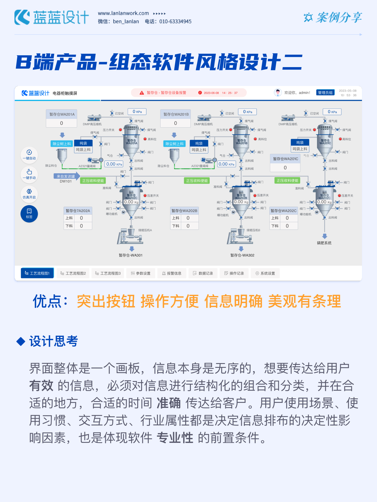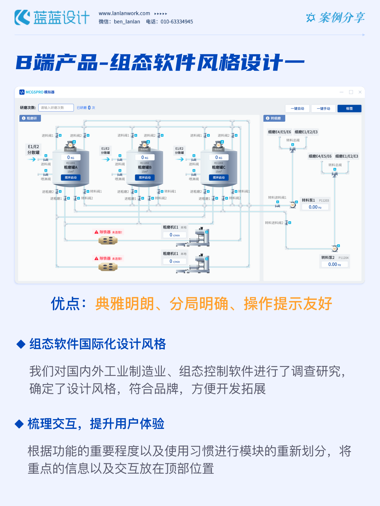 藍(lán)藍(lán)設(shè)計的兩種組態(tài)軟件風(fēng)格都采用符合當(dāng)下審美潮流的2D插畫效果,既保證了視覺效果美觀的同時也降低落地成本,方便后續(xù)的拓展、修改、提升與設(shè)計效率,同時注重用戶的閱讀習(xí)慣,將原功能點重新布局,主次內(nèi)容對比明顯,降低視覺噪音,保證清晰順暢的操作,提升用戶體驗!