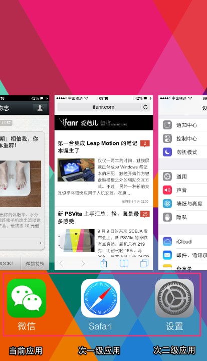 新的多任務(wù)界面依然是通過(guò)雙擊 Home 鍵觸發(fā),但無(wú)論界面和使用方式,和上一代系統(tǒng)已有了本質(zhì)的區(qū)別。