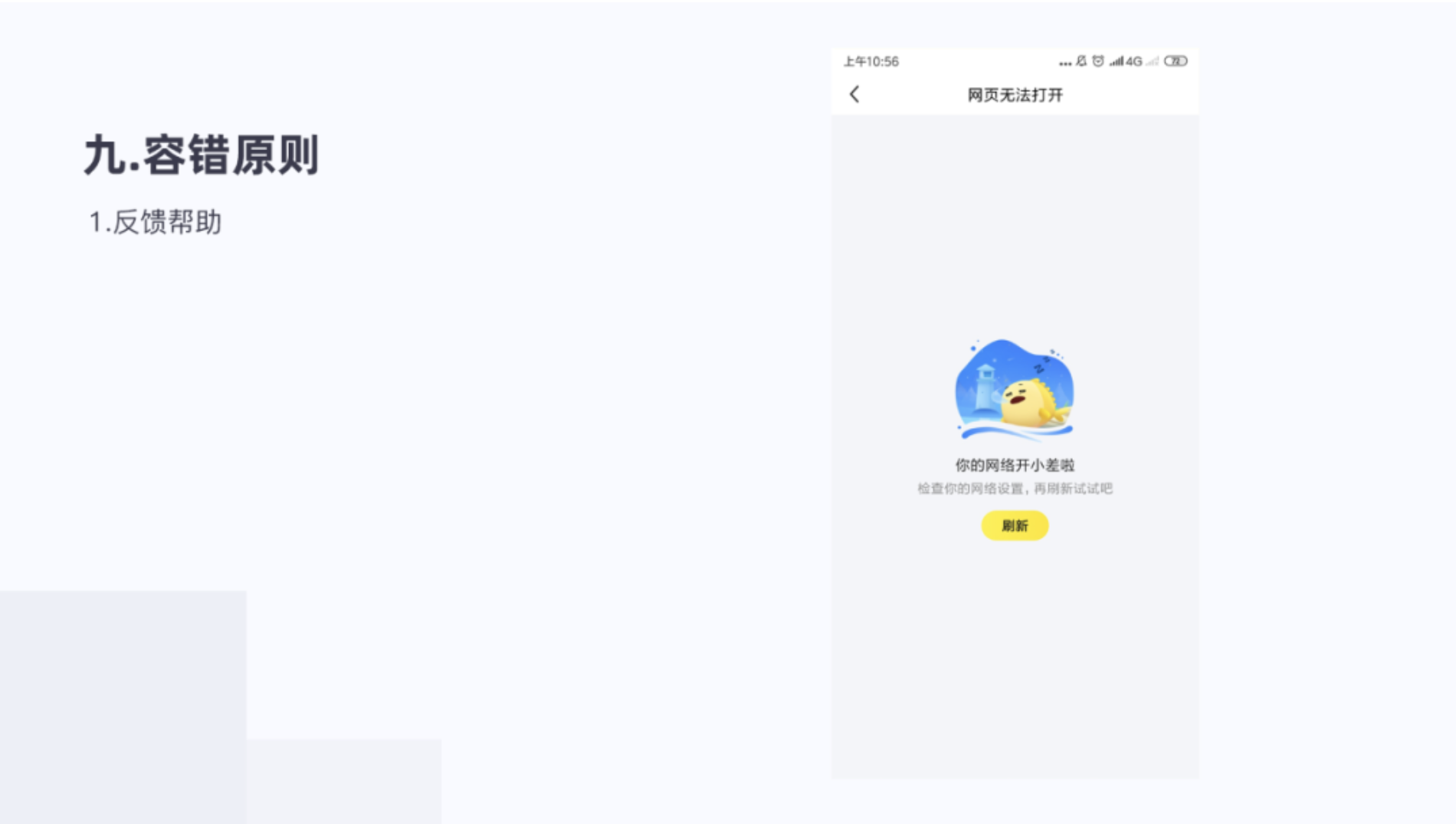 當(dāng)頁面缺失時,畫面出現(xiàn)可愛的卡通缺失頁,產(chǎn)生情感共鳴,同時減少了用戶的認(rèn)知負(fù)擔(dān),讓用戶知道了所處位置和過程。