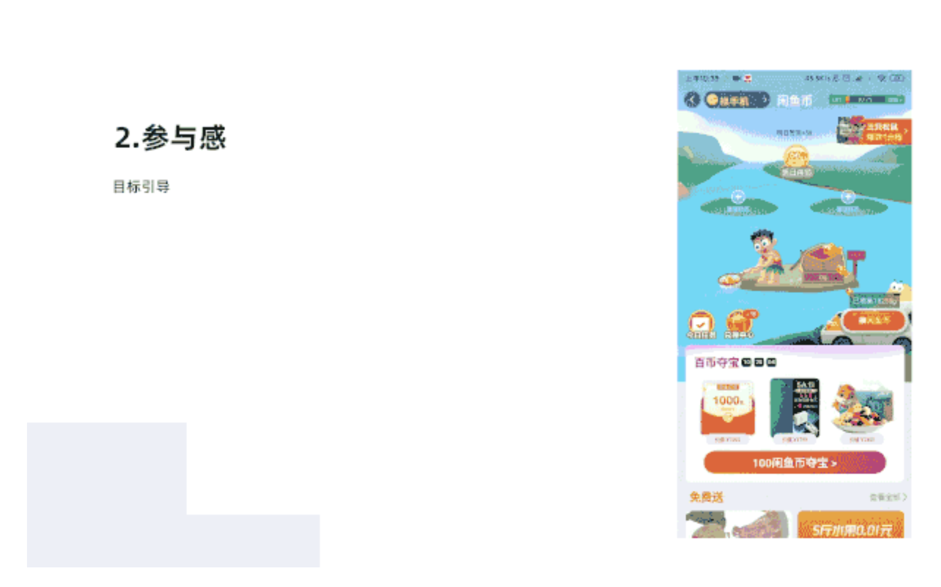 目標(biāo)引導(dǎo)設(shè)計,劃定規(guī)則和目標(biāo)路徑,引導(dǎo)用戶參與其中,在簽到活動頁面一個小路徑,用戶點擊撈魚,撈上來之后,就可以兌換閑魚幣了,讓用戶趣味游戲同時獲得閑魚幣,提升參與感,增強了用戶體驗。