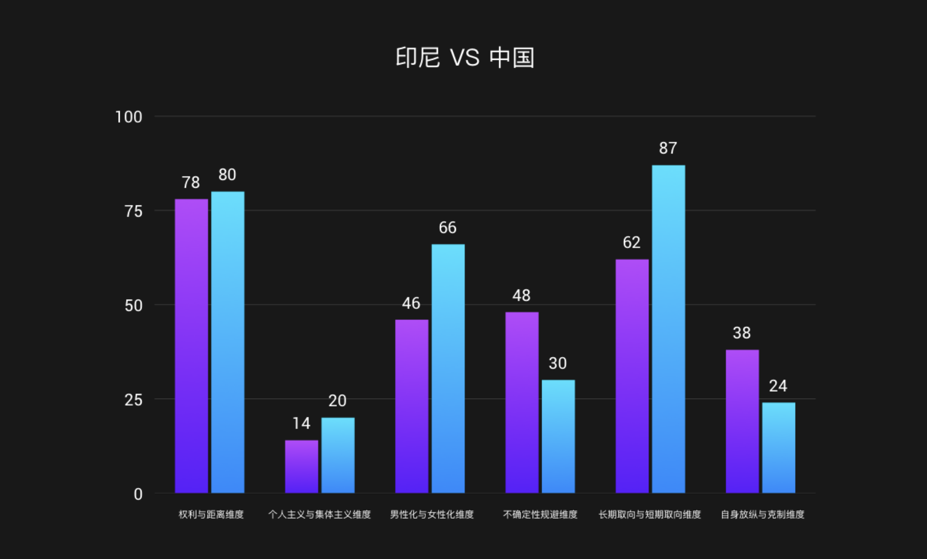 首先建立文化場景,如上圖所示,主體國家是印尼,對比國家是中國。對印尼和中國的群體進(jìn)行文化維度分析。