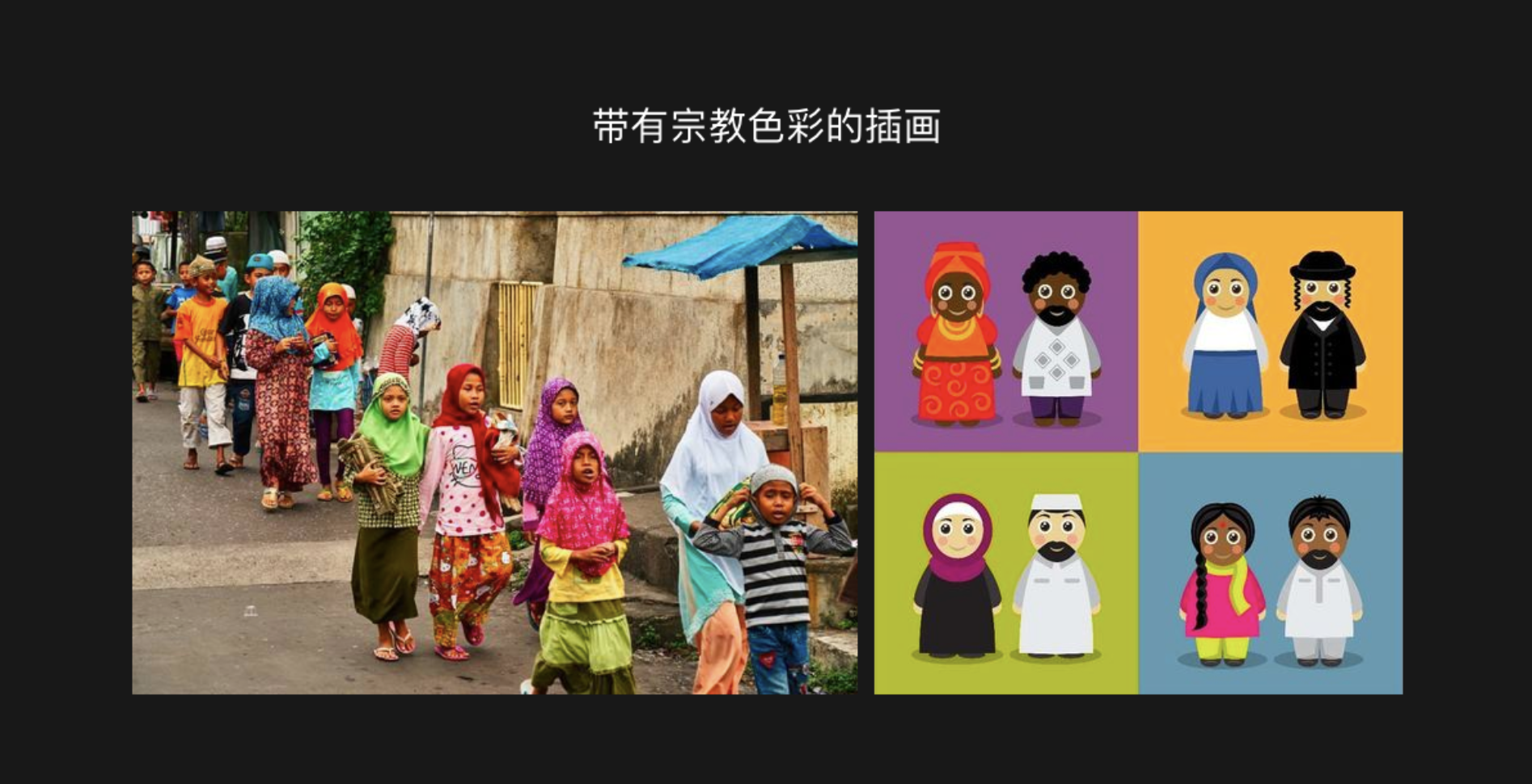 穆斯林在正式的場合,穿著要莊重得體。男性一般身穿白襯衫長褲,女性要戴頭巾,不能穿暴露的服裝。由于宗教的原因,有的女性在日常生活中也會有戴頭巾的習(xí)慣。如果在人物插畫設(shè)計中想要有比較強(qiáng)的宗教色彩,那么可以選擇融入這個元素。