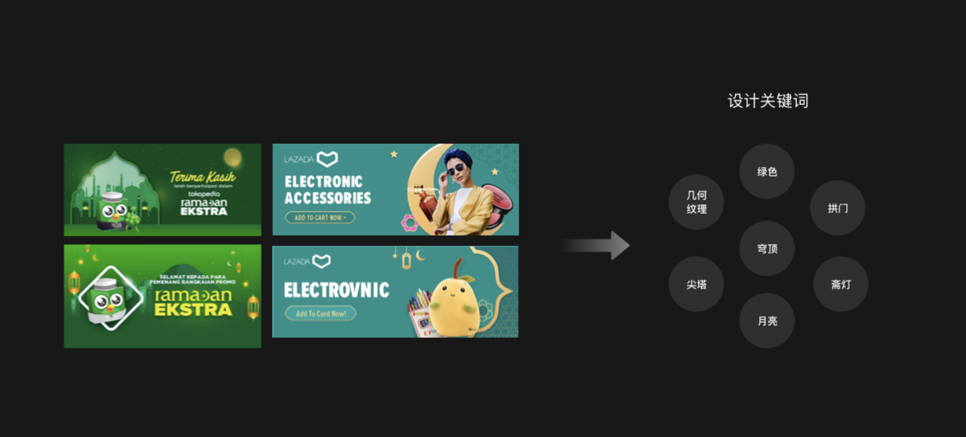 所以在這個期間做活動宣傳時,可以多運用伊斯蘭教的一些元素,例如:齋月的齋燈,月亮,以及伊斯蘭教寺廟的尖塔、穹頂和幾何紋理的裝飾等等,都可以融入到設(shè)計中,形成獨特的本土風(fēng)格,更容易獲得當(dāng)?shù)厝说南矏酆驼J(rèn)可。
