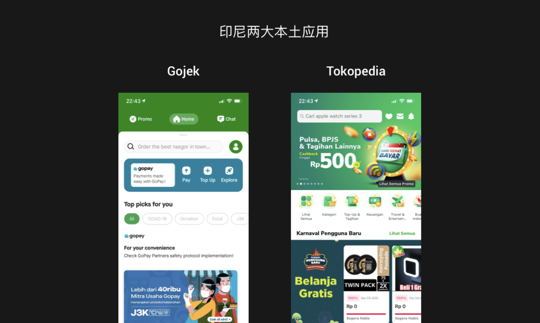 由于是穆斯林國家,綠色深受當(dāng)?shù)厝讼矏邸T谝了固m教中,綠色象征著生命與自然。除了綠色,白色和藍(lán)色也是當(dāng)?shù)厝嗣袼矏鄣念伾T谶x擇自己產(chǎn)品的主色調(diào)時,不妨參考這幾種顏色。下圖是印尼的兩大本土應(yīng)用,Gojek 是當(dāng)?shù)氐囊粋€超級 APP,提供出行、物流、食品、購物、支付等一站式服務(wù),可以理解為是滴滴、美團(tuán)、餓了么、支付寶、順豐等這些公司產(chǎn)品服務(wù)的集合,Tokopedia 是當(dāng)?shù)氐碾娚唐脚_。兩家都選擇了綠色為主色調(diào),這是因為創(chuàng)始人有虔誠的信仰,在伊斯蘭教中,綠色通常被認(rèn)為是伊斯蘭教的象征。