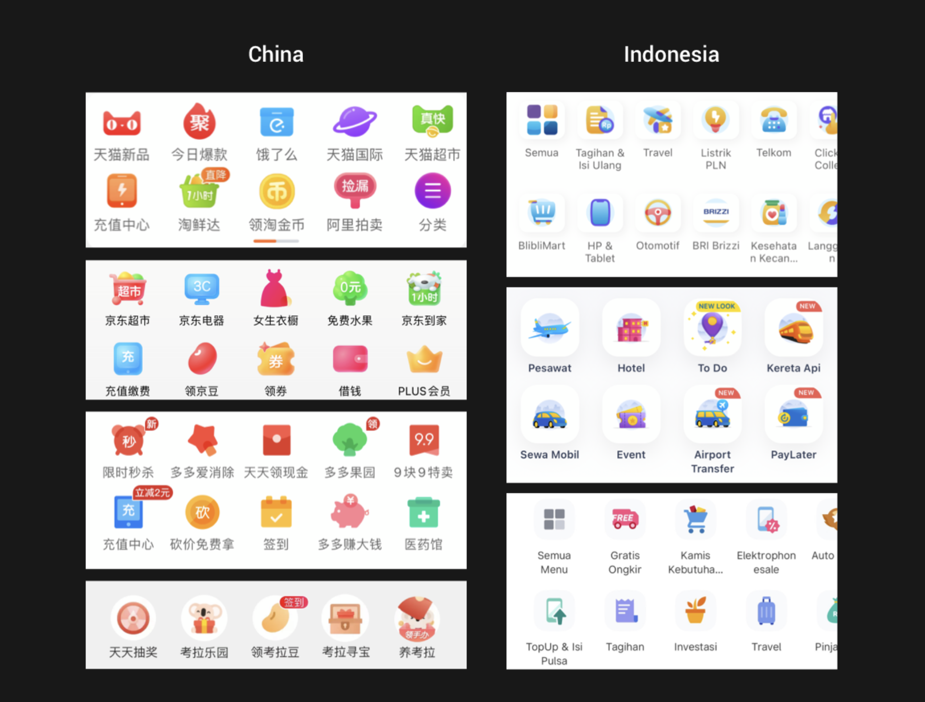 與中國主流的幾家電商平臺相比,印尼的金剛區(qū)圖標(biāo)在細(xì)節(jié)和色彩的處理上更加豐富。如下圖所示,中國的圖標(biāo)色彩比例大部分是:90%的主色+10%輔色;而印尼的圖標(biāo)色彩比例是:70%的主色+30%的輔色。