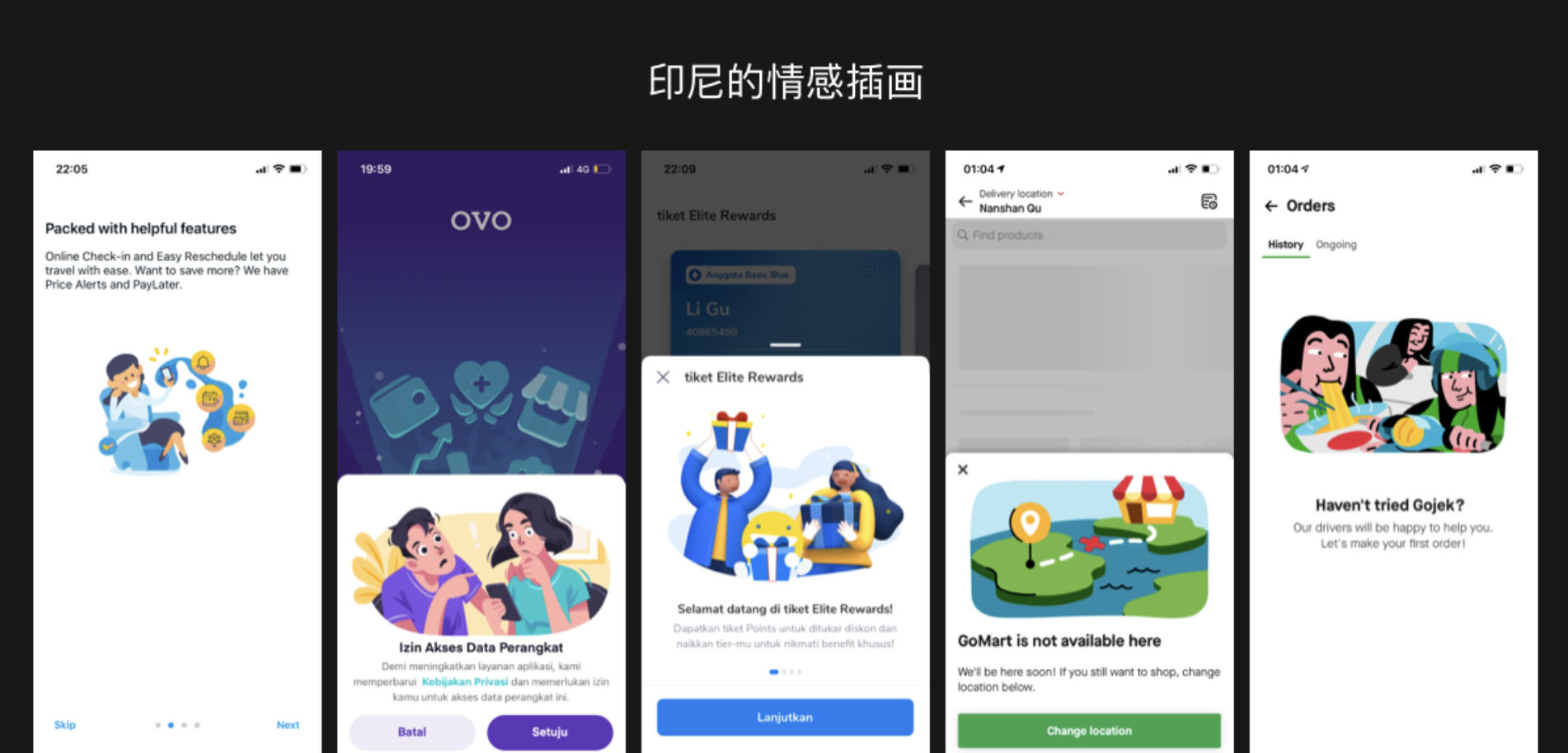 截了幾大主流 APP 的部分插畫場景,都是采用的扁平或 3D 風(fēng)格。在 hofstede 的文化維度研究中,印尼是集體主義國家,集體主義國家在創(chuàng)作上喜歡用生活常見的生活符號來傳遞深層的含義。比如下圖中的引導(dǎo)和缺省頁場景,引導(dǎo)的同時也運用了生動有趣的生活上的情感插畫來緩解和安撫用戶的體驗情緒。在設(shè)計表現(xiàn)上,插畫的色彩鮮明,高飽合的色彩喚醒度較高,容易把用戶的注意力轉(zhuǎn)移到畫面上來,且插畫都是圍繞一個故事性的場景來開展,具有很強(qiáng)的觀賞性,從而打造了良好的用戶體驗流程。