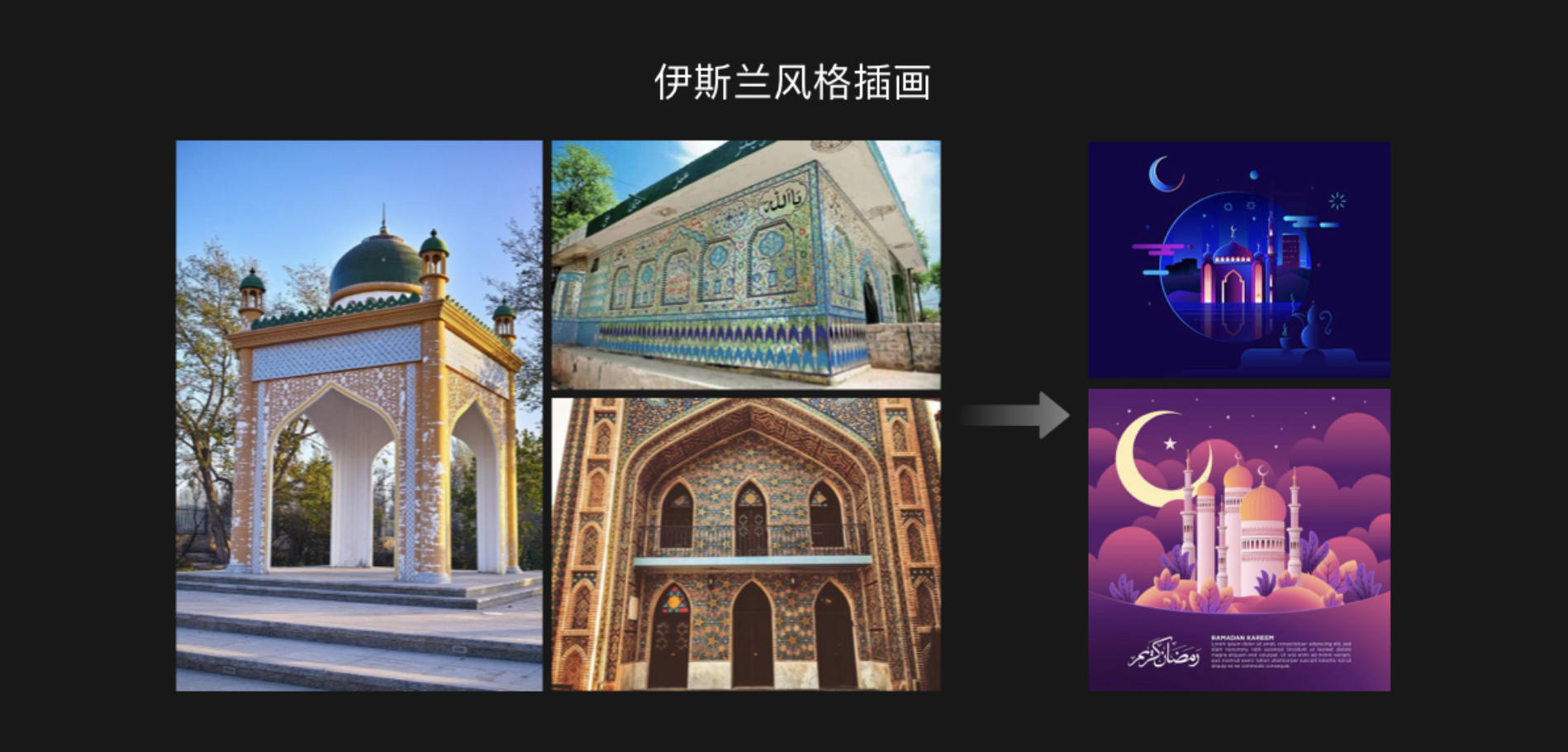 如果是想要創(chuàng)作較強(qiáng)的宗教色彩的風(fēng)格插畫,可以嘗試融入伊斯蘭文化的藝術(shù)。如下圖中插畫中,在造型上就提煉了穹頂、拱門、尖塔的形狀。伊斯蘭藝術(shù)中主要的裝飾物是幾何紋理、植物紋理和文字紋理,紋理之間均衡、對稱、有節(jié)奏感。在色彩上也可以使用藍(lán)綠色,藍(lán)綠色在伊斯蘭藝術(shù)中占有重要地位。裝飾紋理再加上藍(lán)綠色,形成了獨特的伊斯蘭教風(fēng)格藝術(shù)。
