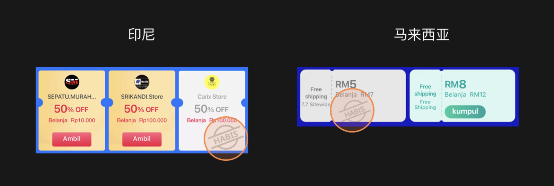 比如說優(yōu)惠券的 Ran out 狀態(tài),印尼和馬來都是 Habis, 都代表結(jié)束的意思。