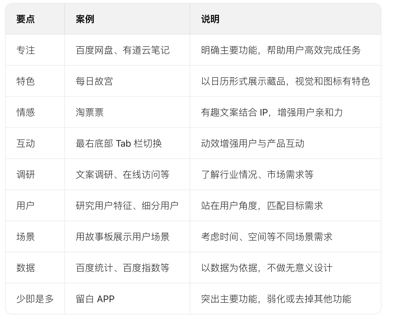 - 答案:設(shè)計(jì)前的案例分析包含專注(明確主要功能)、特色(區(qū)別于同行的功能、體驗(yàn)或視覺)、情感(加入情感化設(shè)計(jì))、互動(dòng)(運(yùn)用動(dòng)效)、調(diào)研(了解行業(yè)和市場(chǎng))、用戶(研究用戶特征和需求)、場(chǎng)景(考慮用戶使用場(chǎng)景)、數(shù)據(jù)(以數(shù)據(jù)為設(shè)計(jì)依據(jù))、少即是多(突出主要功能)這 9 個(gè)關(guān)鍵要點(diǎn)。