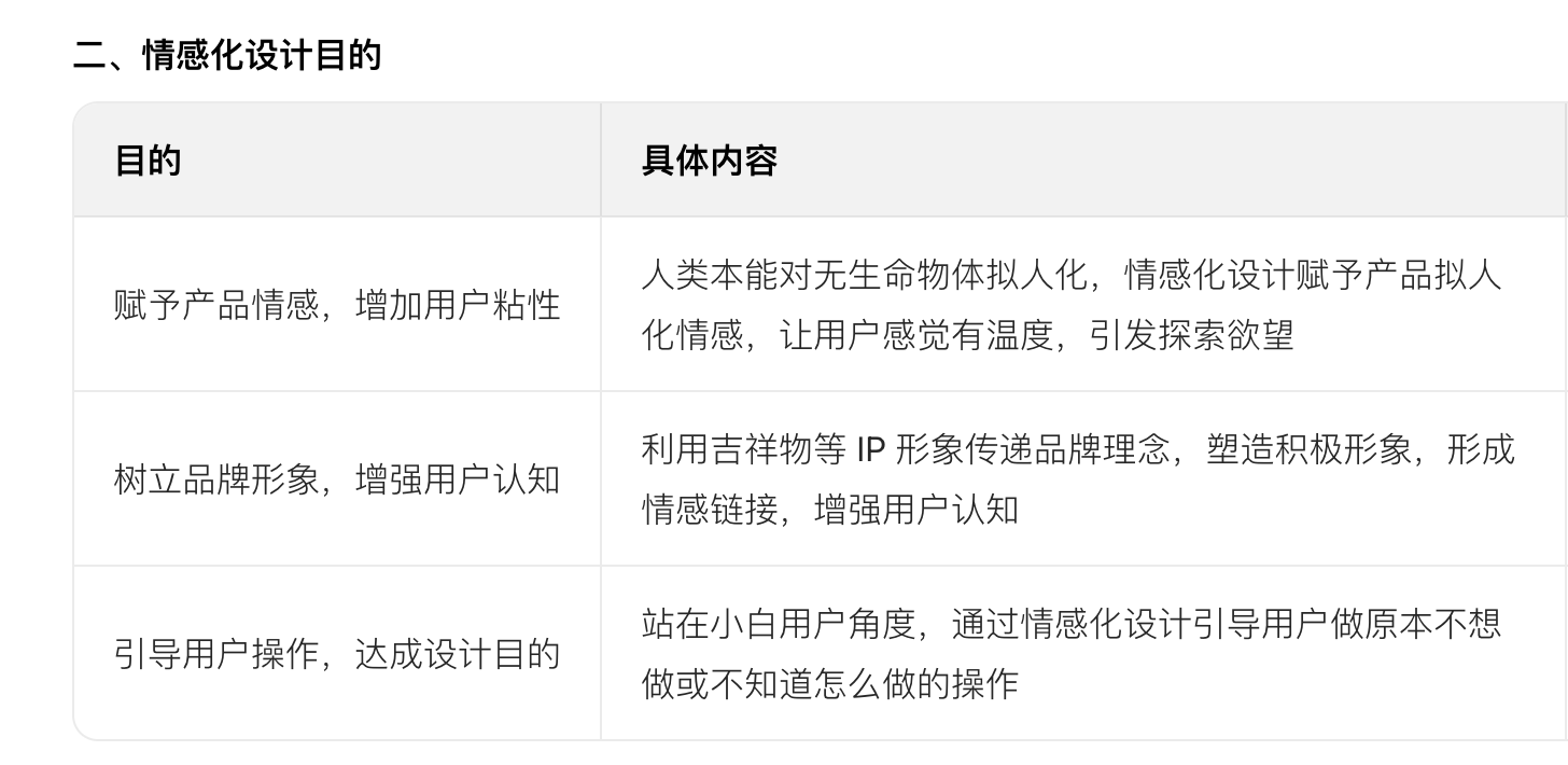 - 答案:本能層次即視覺層次的情感化設(shè)計(jì),主要從三個方面實(shí)現(xiàn)。一是獨(dú)特的 IP 形象設(shè)計(jì),利用高識別度 IP 形象拉近用戶與產(chǎn)品關(guān)系,打造品牌效應(yīng);二是風(fēng)格明確的規(guī)范化設(shè)計(jì),使界面整潔有品質(zhì)感,讓用戶產(chǎn)生舒適情感;三是有趣的擬人化動作設(shè)計(jì),通過產(chǎn)品擬人化互動反饋,讓用戶感到有趣。