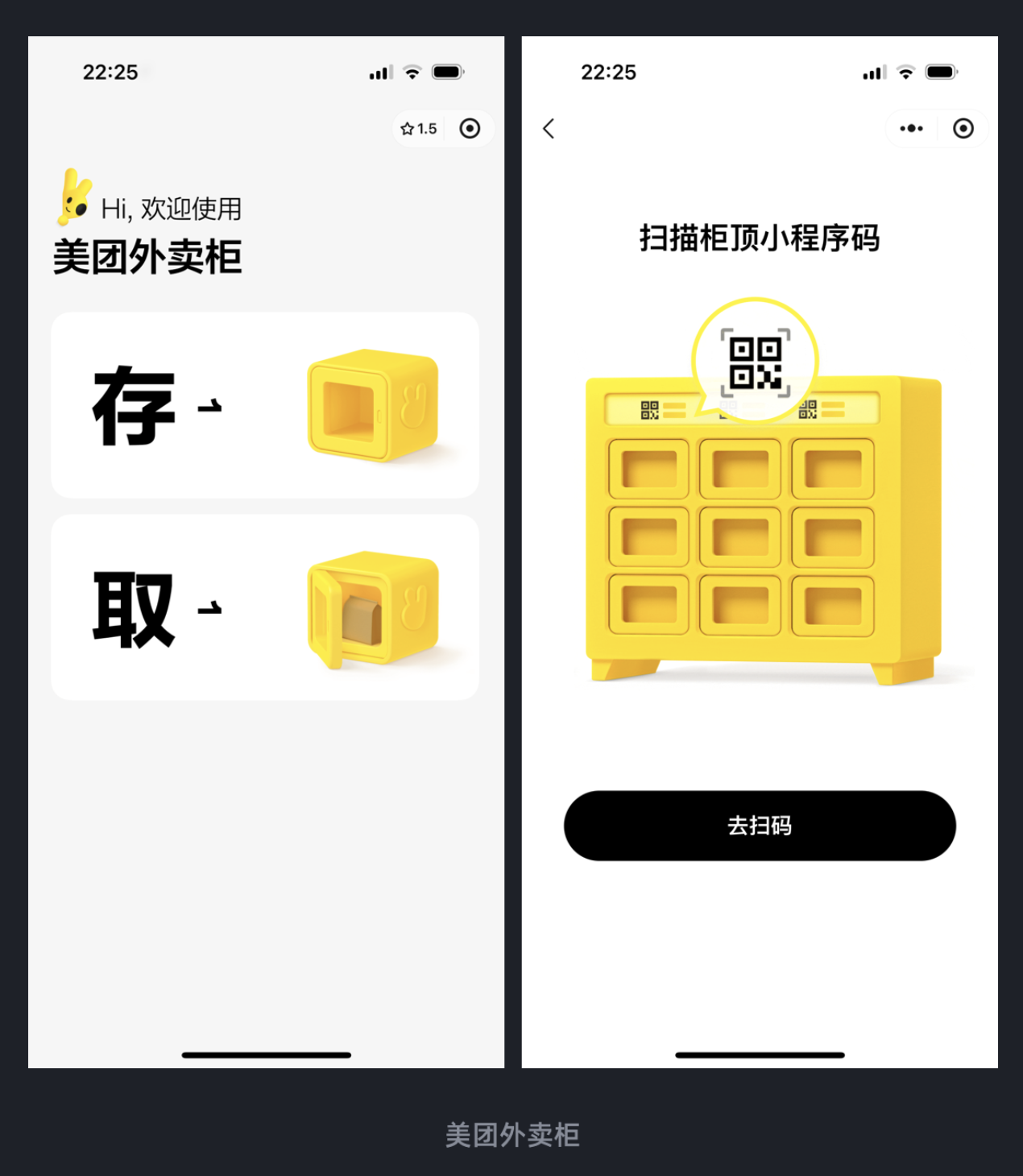 美團(tuán)外賣柜小程序卻反其道而行之 —— 打開界面后,只有 “存” 和 “取” 兩個(gè)核心按鈕,搭配 “掃描柜頂小程序碼” 的簡單指引,沒有任何廣告、推薦等多余元素。