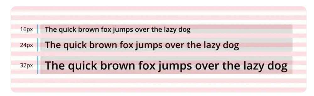 在上方的示例中,每8px行在紅色和白色之間交替。將文字的所有行高設置為基本單位(8x或4px)的倍數(shù),可以讓文本和基線網(wǎng)格完美對齊。
