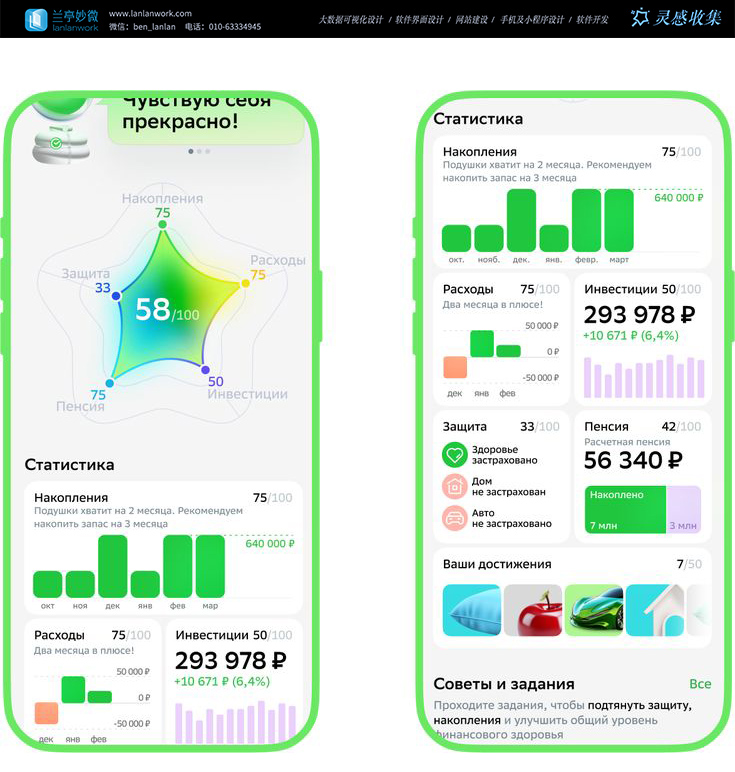 行動引導層:底部的 “Советы и задания”(建議與任務)模塊,將 “提升保險、增加儲蓄” 等理財目標轉化為 “可執(zhí)行的小任務”,搭配 “你的成就” 可視化激勵,讓用戶從 “被動看數(shù)據(jù)” 轉向 “主動做改善”,契合俄語區(qū)用戶偏好 “明確指令 + 即時反饋” 的交互習慣。