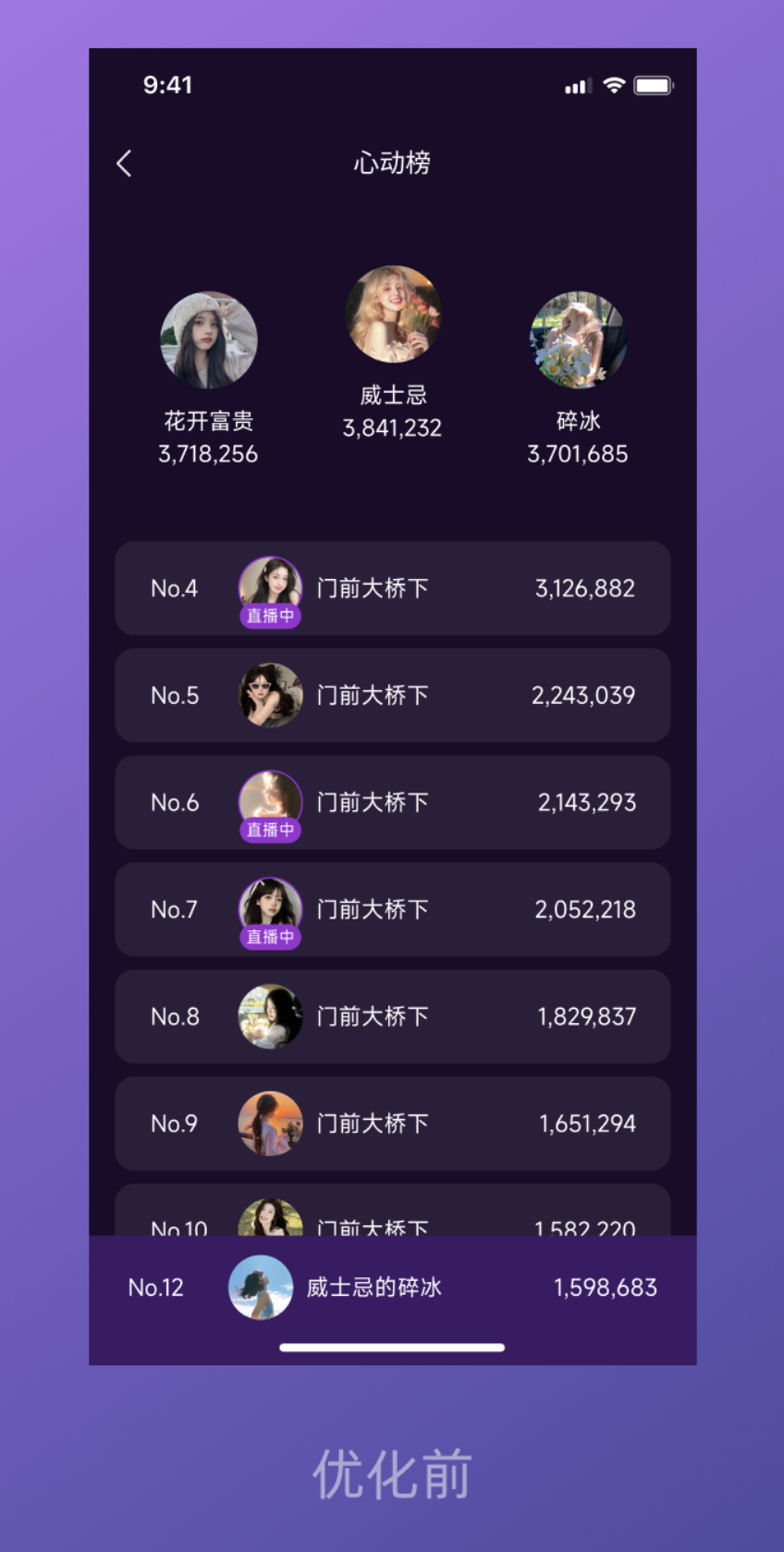 在直播平臺中,排行榜是承載用戶注意力、激發(fā)參與熱情的關(guān)鍵頁面。但很多時候,這類頁面容易陷入 “信息堆砌” 的困境 —— 單調(diào)的列表、直白的數(shù)字,毫無設(shè)計亮點可言。就像這次接到的直播 “心動榜” 優(yōu)化需求,客戶的核心訴求很明確:在不改變核心功能的前提下,讓頁面更具設(shè)計感和吸引力。