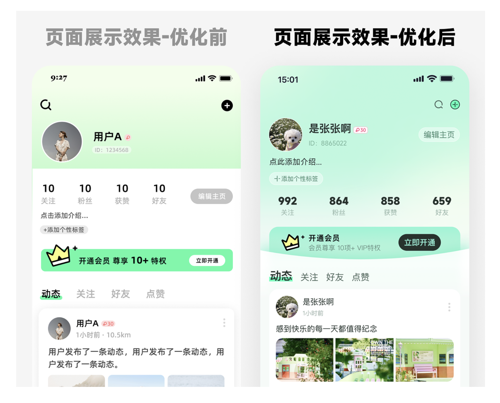 先看看優(yōu)化前后的巨大反差:優(yōu)化前的頁面,正綠色主色調(diào)刺眼,頭像與信息比例失衡,數(shù)據(jù)展示平淡,活動入口普通,動態(tài)卡片冗余信息多,導航欄單調(diào);而優(yōu)化后,色調(diào)柔和協(xié)調(diào),布局緊湊飽滿,重點信息一目了然,整體質(zhì)感直接翻倍。下面就拆解這 7 個核心優(yōu)化思路,幫你避開 “踩坑點”。
