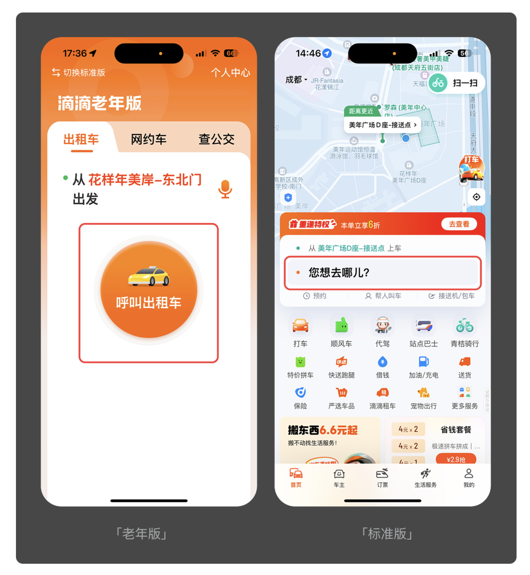 老年用戶的操作耐心與記憶能力相對(duì)有限,過(guò)多的點(diǎn)擊步驟和冗余功能會(huì)顯著增加使用門(mén)檻。滴滴老年版的設(shè)計(jì)堪稱(chēng)典范:摒棄了標(biāo)準(zhǔn)版 “輸入目的地 - 選擇車(chē)型 - 確認(rèn)叫車(chē)” 的復(fù)雜流程,在首頁(yè)直接設(shè)置 “呼叫出租車(chē)” 核心按鈕,老人無(wú)需額外學(xué)習(xí),點(diǎn)擊即可發(fā)起叫車(chē),直觀又高效。無(wú)獨(dú)有偶,QQ 老年版也對(duì) “動(dòng)態(tài)查看” 功能進(jìn)行了優(yōu)化,標(biāo)準(zhǔn)版需要兩次點(diǎn)擊才能進(jìn)入的頁(yè)面,老年版只需一次點(diǎn)擊便可直達(dá),大幅提升了操作效率。這種 “減法設(shè)計(jì)” 的核心,是剝離非必要功能,讓老人的注意力集中在核心需求上,避免被無(wú)關(guān)信息干擾。