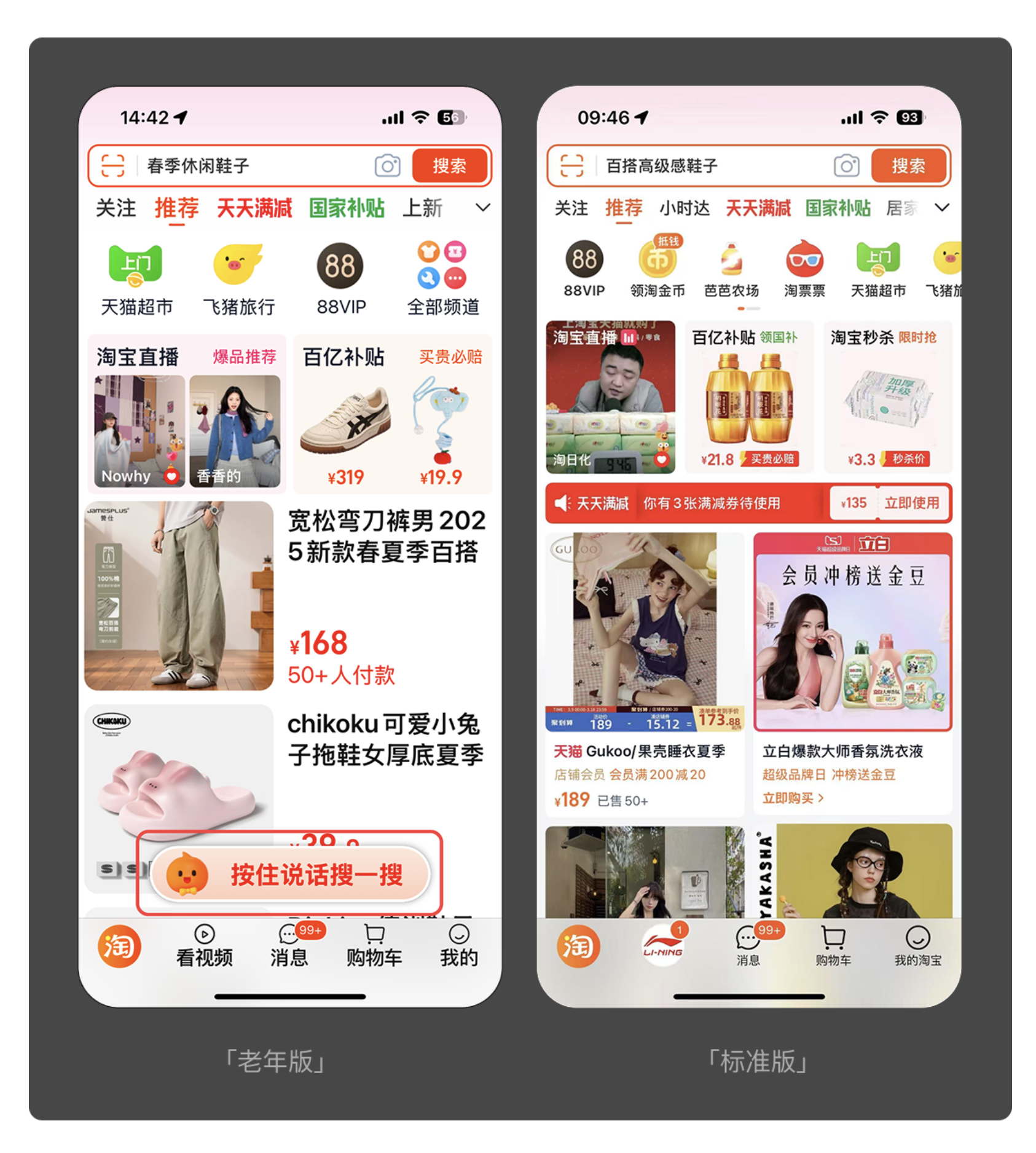 打字對(duì)于許多老人而言是一大難題 —— 視力模糊導(dǎo)致按鍵不準(zhǔn)、拼音基礎(chǔ)薄弱難以拼寫(xiě),這些都讓文字輸入成為數(shù)字使用的 “攔路虎”。語(yǔ)音操作的引入,恰好解決了這一痛點(diǎn)。淘寶老年版在底部導(dǎo)航欄設(shè)置了顯眼的 “按住說(shuō)話搜一搜” 按鈕,老人只需說(shuō)出商品名稱(chēng),即可完成搜索,無(wú)需手動(dòng)輸入;中國(guó)工商銀行老年版也加入了 “語(yǔ)音操作” 功能,查詢賬戶余額、辦理生活繳費(fèi)、購(gòu)買(mǎi)理財(cái)產(chǎn)品等操作,都能通過(guò)語(yǔ)音指令完成,極大簡(jiǎn)化了操作流程。語(yǔ)音交互以更自然的方式搭建起老人與產(chǎn)品的溝通橋梁,讓操作門(mén)檻大幅降低。