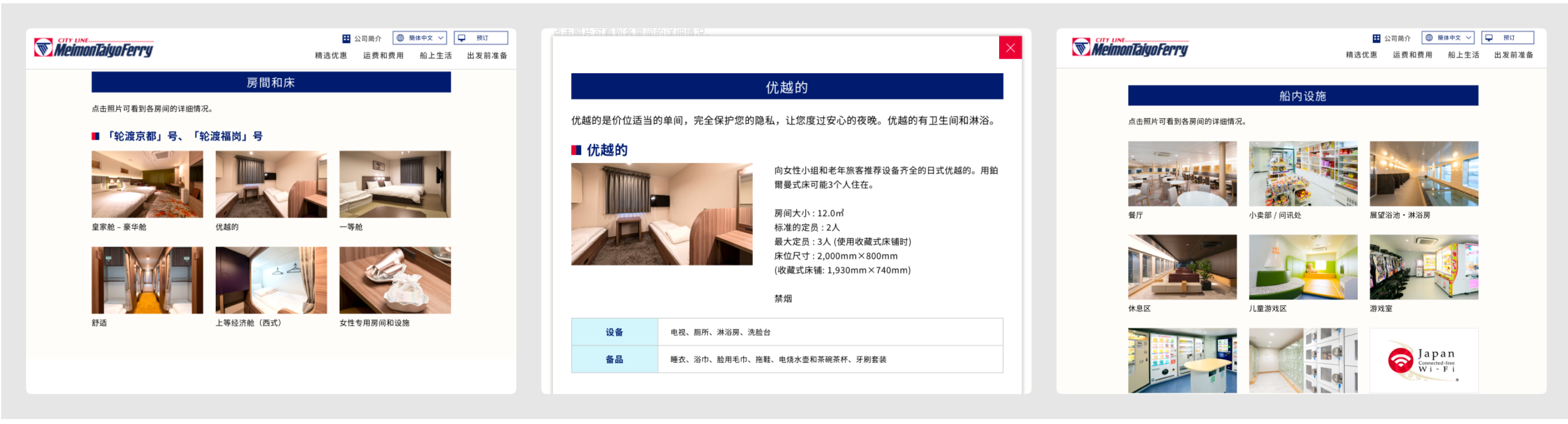 步驟1:打開(kāi)官網(wǎng),到 [船上生活] 模塊查看有哪些船(只有兩艘)和房型,以及船上有哪些服務(wù)設(shè)施等。