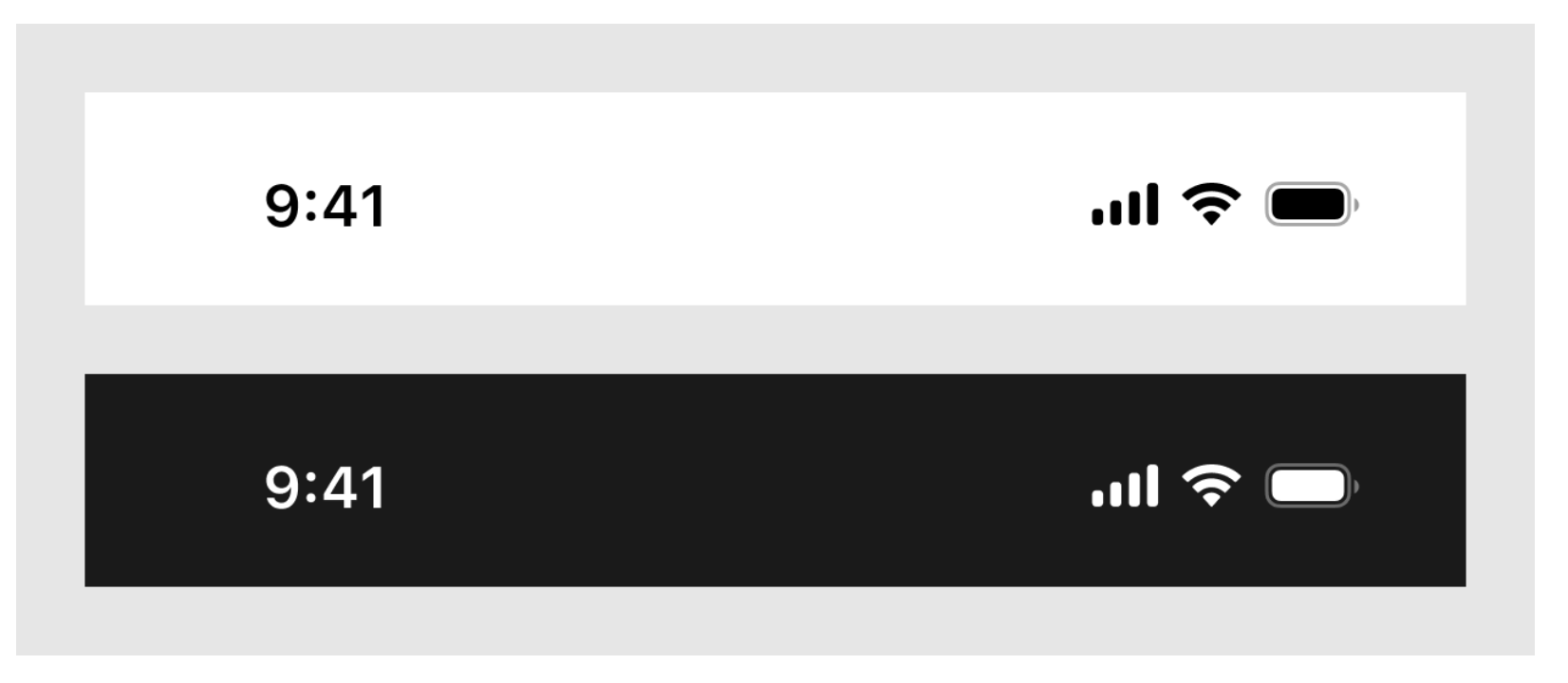 位于屏幕頂部邊緣,核心功能是展示設(shè)備狀態(tài)信息,包括時(shí)間、運(yùn)營(yíng)商、電池電量等。豎屏模式下幾乎所有頁(yè)面強(qiáng)制顯示,僅全屏視頻、圖片等場(chǎng)景可暫時(shí)隱藏。狀態(tài)欄僅支持黑白兩色,選擇標(biāo)準(zhǔn)以 “與背景對(duì)比度最高” 為原則,iOS 會(huì)自動(dòng)適配,設(shè)計(jì)師需避免設(shè)計(jì)稿中出現(xiàn)對(duì)比度不足的情況。
