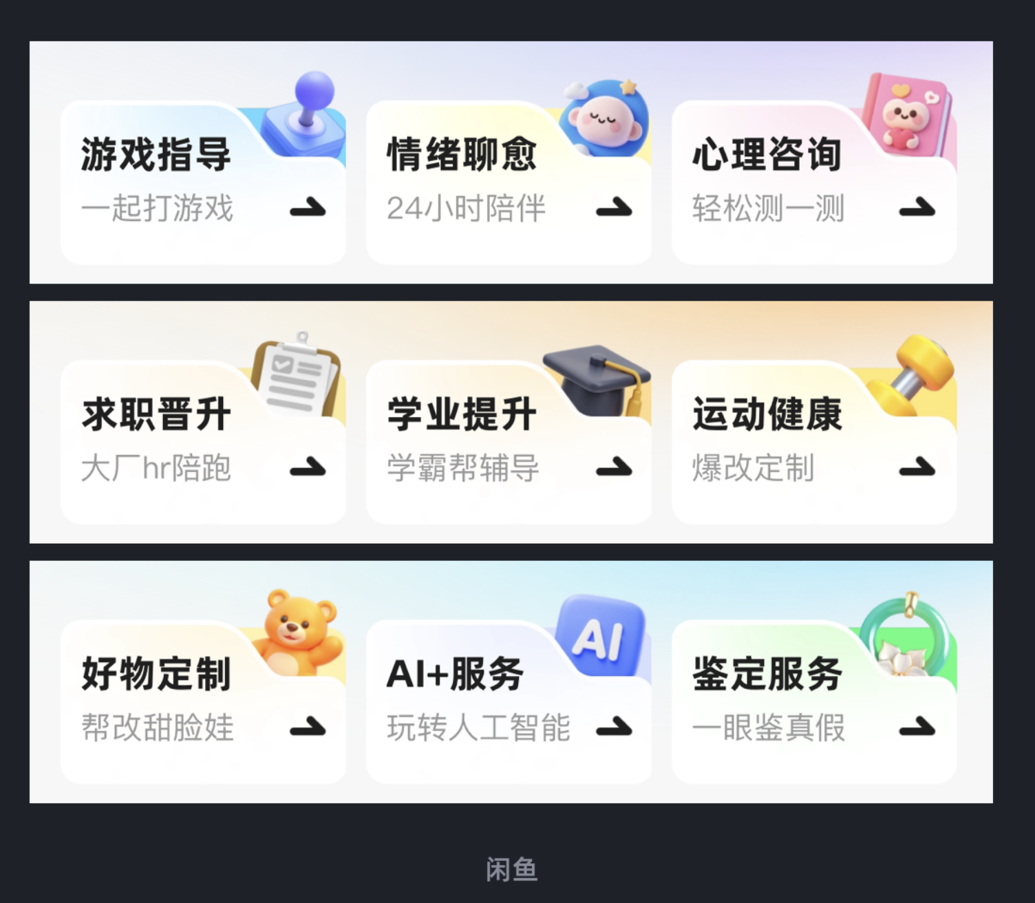 閑魚副業(yè)欄目的設(shè)計將這一點發(fā)揮得淋漓盡致,首先讓卡片一角做凹陷的異形處理,把功能圖標精準嵌入凹陷區(qū)域,形成 “卡片 - 圖標” 的貼合感;再通過背景卡片的色彩與層級襯托,讓整組設(shè)計形成多層疊加的視覺效果。異形卡片打破了常規(guī)的規(guī)整感,圖標與凹陷的結(jié)合讓元素布局更巧妙,多層結(jié)構(gòu)則進一步強化了模塊區(qū)分,讓整個界面既富有設(shè)計感,又能讓用戶快速識別不同功能模塊。