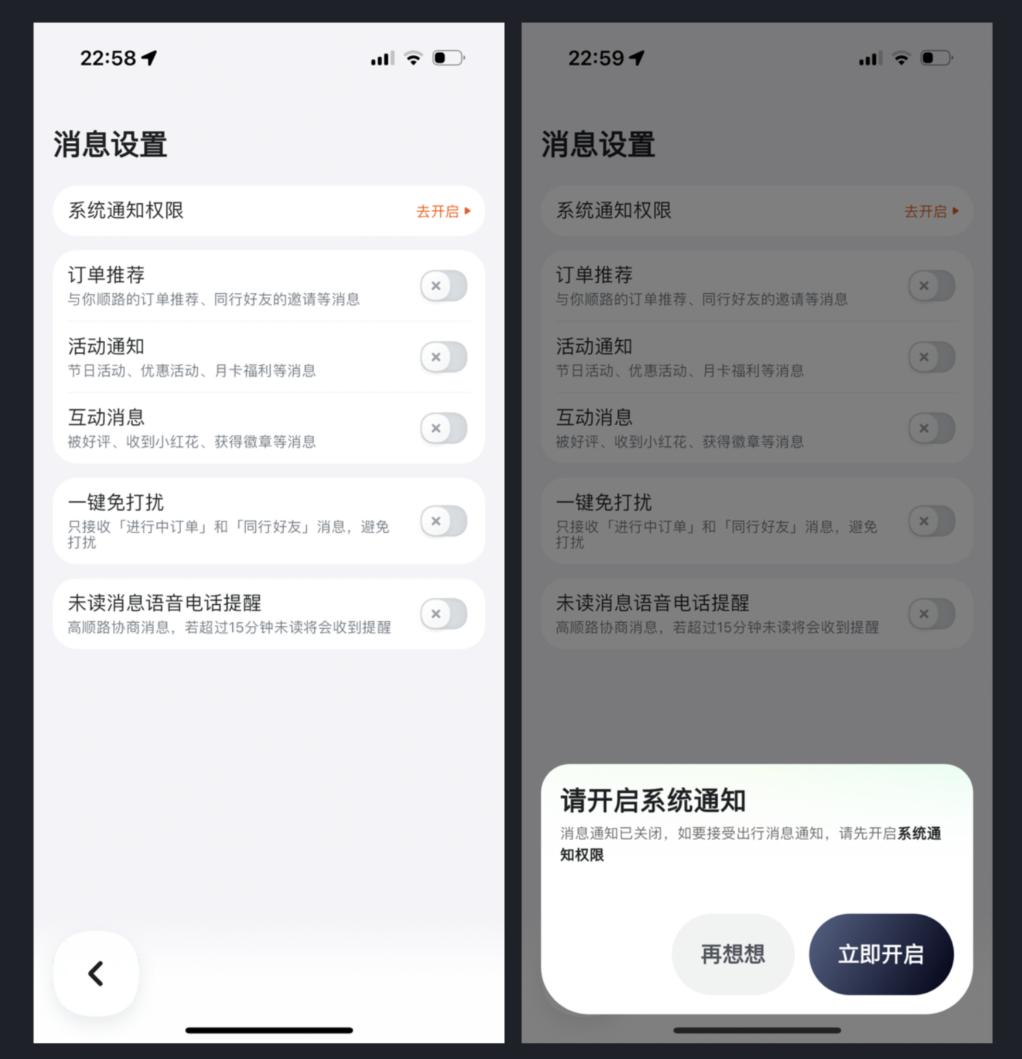嘀嗒出行的消息設(shè)置設(shè)計就極具人性化,它沒有刻意弱化關(guān)閉按鈕,反而讓操作更直觀;同時為了避免消息過度干擾,特意設(shè)計了 “一鍵免打擾” 功能,讓用戶可自主選擇僅接收核心消息。這種設(shè)計摒棄了 “單向引導(dǎo)” 的思維,而是賦予用戶選擇權(quán),既實現(xiàn)了引導(dǎo)開啟通知的核心目的,又兼顧了用戶的使用體驗,讓交互設(shè)計更有溫度。