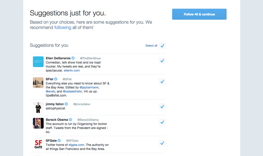 例如,Twitter為了強化習(xí)慣路徑,在新手引導(dǎo)流程中建議新用戶可以關(guān)注的人。一旦確定某個路徑能促進用戶路轉(zhuǎn)粉,你也會想做類似的事情。