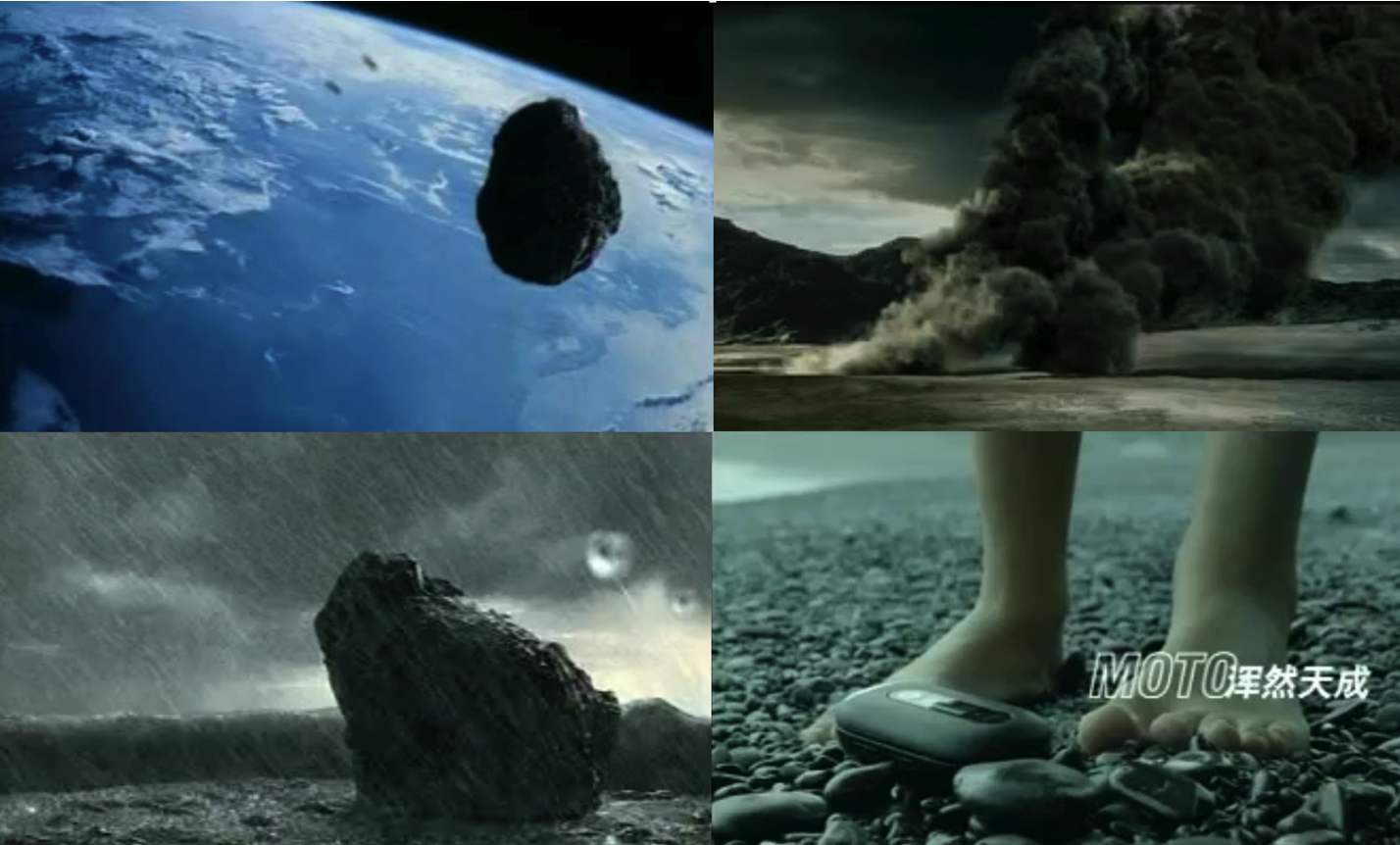 想到這里,我記得個(gè)人非常喜歡MOTO的一款手機(jī)U6,它的廣告也同樣精彩:一塊太空隕石轟然墜落大氣層,歷經(jīng)風(fēng)吹日曬、雨雪凌虐,在歲月洗禮中,滄海桑田,最后成為沙灘上一顆圓滑的黑色鵝卵石,一個(gè)美女撿起打開,聲音響起:Hello Moto!
