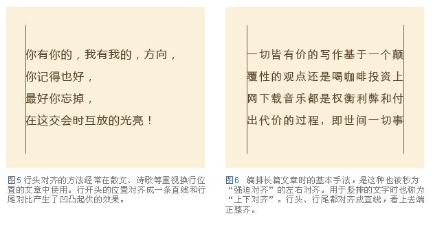 排版中重要的一條,是把應(yīng)該對(duì)齊的部分對(duì)齊,例如每一個(gè)段落的字行對(duì)齊,就是把行的位置進(jìn)行對(duì)齊使其一致的方法。行頭對(duì)齊是所有行均在行頭對(duì)齊的方法(圖5)雖說這種用法使得行尾不齊整,但方便文章的停頓部分換行,適用于散文、詩歌等表現(xiàn)韻味的文字版式。但是,對(duì)于編排長(zhǎng)篇文章時(shí),選擇左右對(duì)齊更能體現(xiàn)條理性。由于換行的位置都相同,閱讀行頭或換行的時(shí)候視線能夠平緩流暢地移動(dòng)。