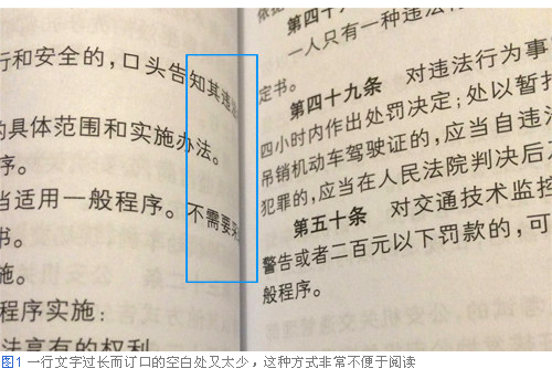 在設(shè)計(jì)工作中,如果有100個(gè)人就會(huì)有100種設(shè)計(jì)理論,我認(rèn)為并不能總結(jié)出一條絕對(duì)正確的理論。但是,如果完全沒有什么設(shè)計(jì)理論的話,貌似會(huì)使設(shè)計(jì)顯得很奇怪。比如,經(jīng)常會(huì)看到這種書籍(圖1),一行文字過長(zhǎng)而訂口的空白又處理得不太合適。只要看到這樣的設(shè)計(jì),馬上就會(huì)想到“這里好像沒有規(guī)則啊”,還會(huì)讓人產(chǎn)生“這本書的設(shè)計(jì)師好像不讀書啊”這樣的感覺。在閱讀過程中哪怕只有一些地方令人難以理解,也會(huì)讓人精神不集中,不能徹底關(guān)注文章本身。如果是一個(gè)讀書的人,他自己看看這樣的設(shè)計(jì),自己也會(huì)感到這種方式不便于閱讀啊。所以我認(rèn)為電子書的閱讀感受也是這樣,要做出理想的版面,作為設(shè)計(jì)者需要站在讀者的角度考慮,應(yīng)該尋找對(duì)于自己來說便于閱讀的排版。因此,也借此機(jī)會(huì)來整理出網(wǎng)易云閱讀產(chǎn)品中,書籍正文文字排版的相關(guān)規(guī)則。