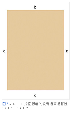 首先在書籍編排過程中,設(shè)定頁面四周的余白來安排頁面的排版。頁邊空白的大小不同,排版效果給讀者帶來的印象也會(huì)發(fā)生變化,因此需要適當(dāng)?shù)剡M(jìn)行處理。雖然紙質(zhì)書籍已經(jīng)有了莫里斯所提倡的版面設(shè)定理論,但是這些理論并不適合于顯示在硬件設(shè)備上。因此我們需要根據(jù)不同的媒體特點(diǎn)來進(jìn)行處理。如圖(2) 有顏色的部分是版面,abcd版面標(biāo)準(zhǔn)的設(shè)定通常是按照1:1.2:1:1.7的比例來進(jìn)行設(shè)計(jì)。