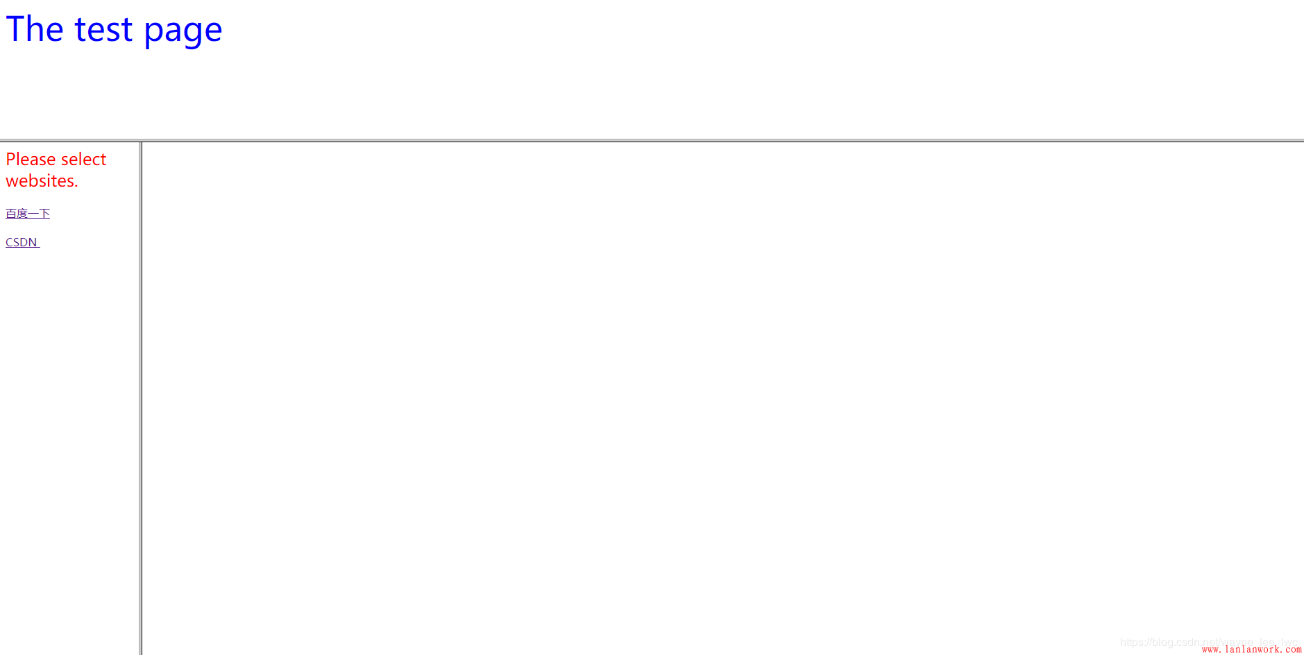 <html> <head></head> <frameset rows="500,*" border="3" noresize="noresize"> </frame> </html>看上面的代碼,用frameset替換掉body不難理解,畢竟我們約定做框架的網(wǎng)頁不具有實(shí)體內(nèi)容 接著,這里提到了框架標(biāo)簽的三個(gè)屬性,分別為: rows/cols 框架的分行或分列 border 分隔框的寬度 noresize 大小是否可調(diào) 現(xiàn)在來分別解釋一下 第一個(gè),rows 或cols 屬性,代表了框架的分行或分列的情況,在引號(hào)內(nèi)書寫該屬性的值的時(shí)候,不需要指明分成幾欄,只需要指明每一欄占據(jù)的寬度或高度(單位為像素)并使用逗號(hào)隔開。瀏覽器在解析的時(shí)候會(huì)計(jì)算到底分成了幾欄。另外,不指定寬度而使其占據(jù)剩余位置時(shí),可以使用通配符 “ * ”。 第二個(gè),border 屬性,代表了分隔框的寬度,這是屬性的數(shù)值單位是像素。所以如果你不想加入邊框,則可以將它設(shè)置為零。 第三個(gè),noresize 屬性,表示我們的框架的大小是否可調(diào),frameset標(biāo)簽?zāi)J(rèn)為大小可調(diào),當(dāng)用戶鼠標(biāo)移動(dòng)到邊框上時(shí),他可以拖拽改變大小。所以如果不想讓用戶隨意改變框架大小,那么可以選擇使用這個(gè)屬性 (當(dāng)然,也可以選擇把邊框的寬度設(shè)為零,讓他找不到)。 這個(gè)屬性的值同屬性名稱一樣。 最后還需要說明的是:框架集標(biāo)簽是可以進(jìn)行嵌套的,也就是說,在已經(jīng)分出來的框架中,我們可以借著分欄。 在框架內(nèi)鑲嵌網(wǎng)頁 剛剛我們使用 frameset 標(biāo)簽將網(wǎng)頁變成框架并劃分成了若干區(qū)域,每一個(gè)區(qū)域都是一個(gè)單獨(dú)的可顯示頁面的子網(wǎng)頁(筆者起的名)?,F(xiàn)在,我們需要在這些區(qū)域內(nèi)為它鑲嵌上一個(gè)網(wǎng)頁,這需要用到frame這個(gè)單標(biāo)簽在框架下添加網(wǎng)頁,它的寫法如下: <frame src="...." name="...." /> 1 這里可以看到 frame 標(biāo)簽的兩個(gè)屬性; src 和 name 。它們分別代表著添置連接(這是一個(gè)超鏈接,網(wǎng)頁,HTML文件,圖片等都是可以的。有關(guān)超鏈接的信息,可參照上一篇學(xué)習(xí)總結(jié)或者問問度娘 ),以及框架名稱。 框架的命名,很主要的一個(gè)原因在于可以重復(fù)利用一個(gè)框架,即在其他標(biāo)簽使用時(shí),可以在某個(gè)框架上顯示相應(yīng)內(nèi)容。還記得上一篇中,我們提到的鏈接標(biāo)簽 target 屬性中的 “某框架名稱” 這個(gè)值嗎?在為框架命名后,就可以使用上述的 target 用法,將打開的網(wǎng)頁放在某個(gè)框架中了。 綜上,舉個(gè)例子: 先來創(chuàng)造一個(gè)帶有嵌套的框架<!--frame--> <html> <head></head> <frameset rows="200,*" border="5" noresize="noresize"> <frame src="title.html" name="title" /> <frameset cols="200,*"> <frame src="selection_bar.html" /> <frame name="output_page" /> </frameset> </frameset> </html><!--title--> <html> <head></head> <body> <font size="7" color="blue"> The test page </font> </body> </html>