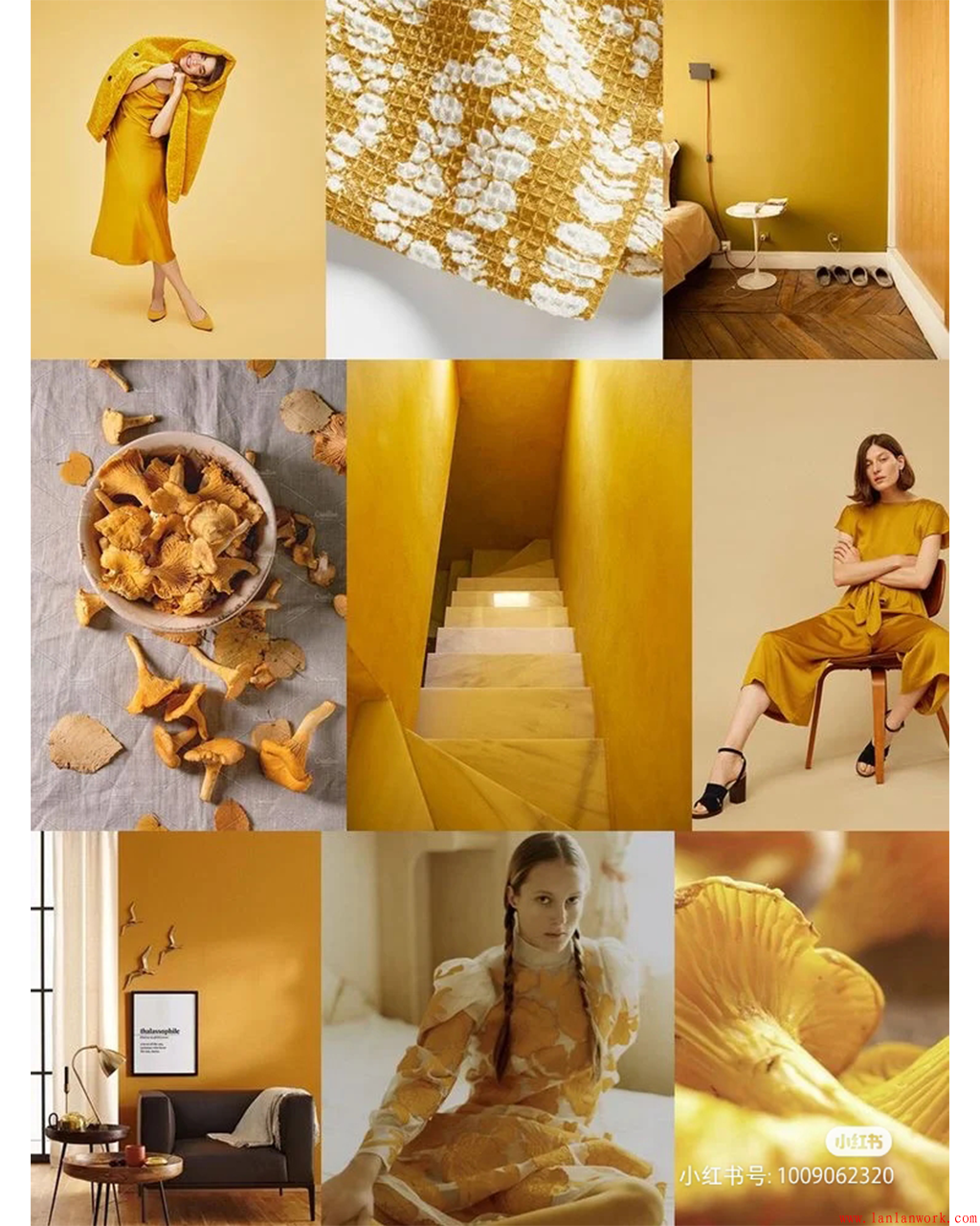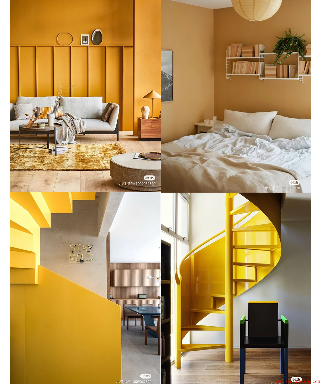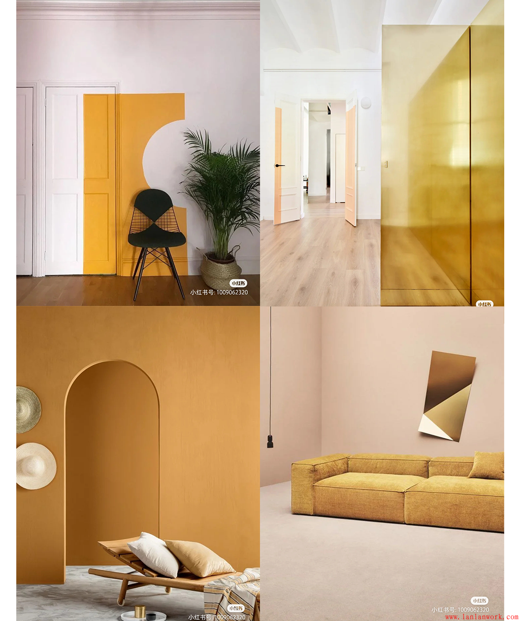 古今中外,不管是建筑還是著裝,金黃色一直是富貴華美的象征。上面一組家居裝飾,分別從黃色系中汲取顏色,或亮黃色,或金黃色,或金色,用于門、墻壁、地板、樓梯、沙發(fā)、椅凳的色彩搭配,甚至屋內(nèi)的女主人也穿著金黃色的服飾和裙裝,高貴奪目的氣質(zhì)不言而喻。而不同飽和度和明度的黃色和金色用在木質(zhì)的實(shí)色門,玻璃的半透明門,水泥的墻壁,布藝的沙發(fā)上,又各有千秋。