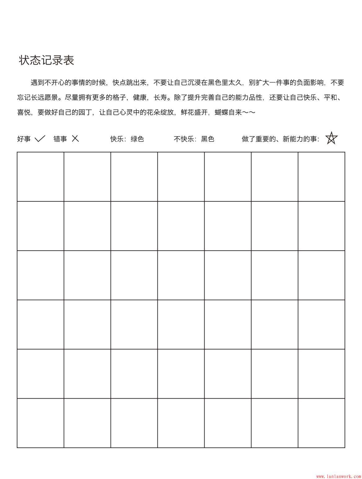 還有一種填色法,以快樂(lè)和不快樂(lè)來(lái)分,可以把自己人生想象成三萬(wàn)天三萬(wàn)個(gè)小格子,當(dāng)你平靜喜悅的時(shí)候,你的格子里的顏色是綠色,當(dāng)你悲傷,憤怒,崩潰的時(shí)候,你的格子里的顏色就是黑色。遇到不開(kāi)心的事情的時(shí)候,快點(diǎn)跳出來(lái),不要讓自己沉浸在黑色里太久,別擴(kuò)大一件事的負(fù)面影響,不要忘記你的長(zhǎng)遠(yuǎn)愿景。
