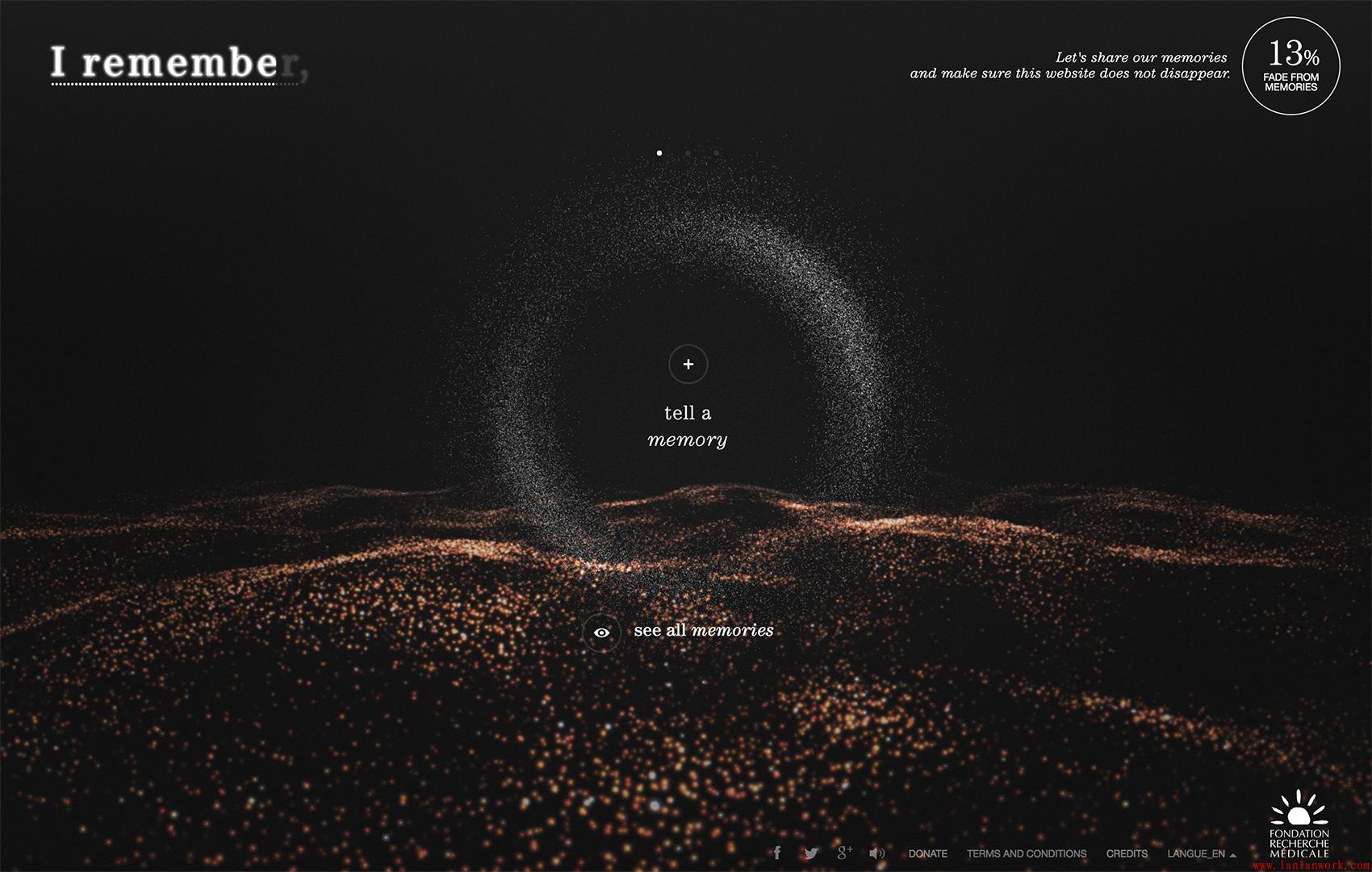 對(duì)于I Remember網(wǎng)站,主界面(動(dòng)畫)立即引人注目,因?yàn)樗?qǐng)互動(dòng)。雖然動(dòng)作和界面是功能性導(dǎo)航工具,但視覺(jué)設(shè)計(jì)師利用這些元素的潛在損失作為傳達(dá)網(wǎng)站潛在使命的方式:阿爾茨海默病。就像組織為其籌集資金的患者的褪色記憶一樣,如果沒(méi)有積極的互動(dòng),網(wǎng)站就會(huì)慢慢消失。