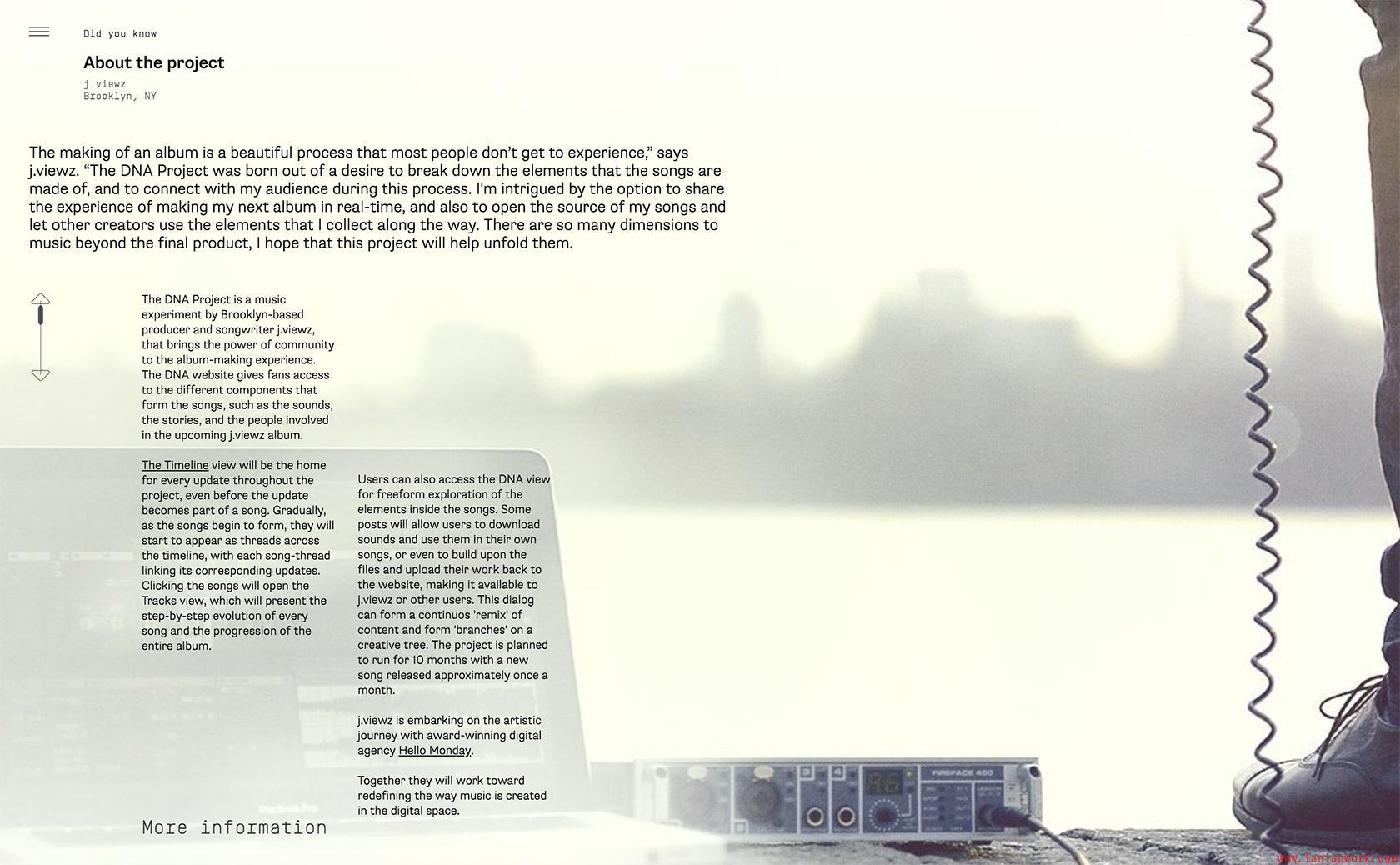 例如,DNA項(xiàng)目是一個(gè)使用一系列脫節(jié)層次結(jié)構(gòu)來(lái)傳達(dá)音樂(lè)家專輯創(chuàng)意結(jié)構(gòu)的網(wǎng)站。該網(wǎng)站的結(jié)構(gòu)很復(fù)雜,專輯的結(jié)構(gòu)也是如此。